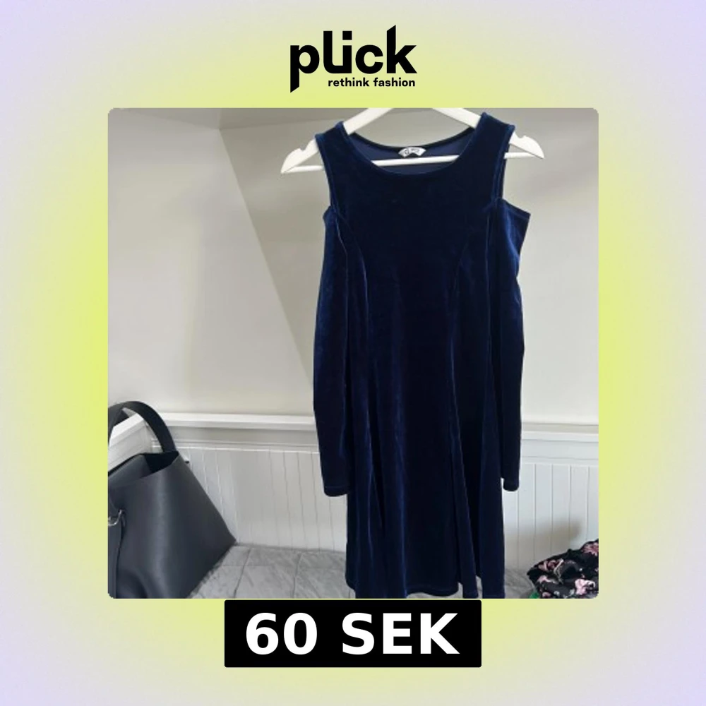 Säljer en snygg mörkblå klänning i sammet med cold shoulder-design och breda axelband. Klänningen har en mjuk känsla och är perfekt för dig som gillar en stilren men trendig look.