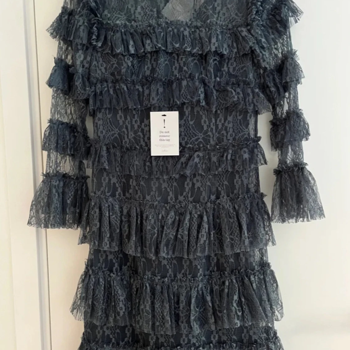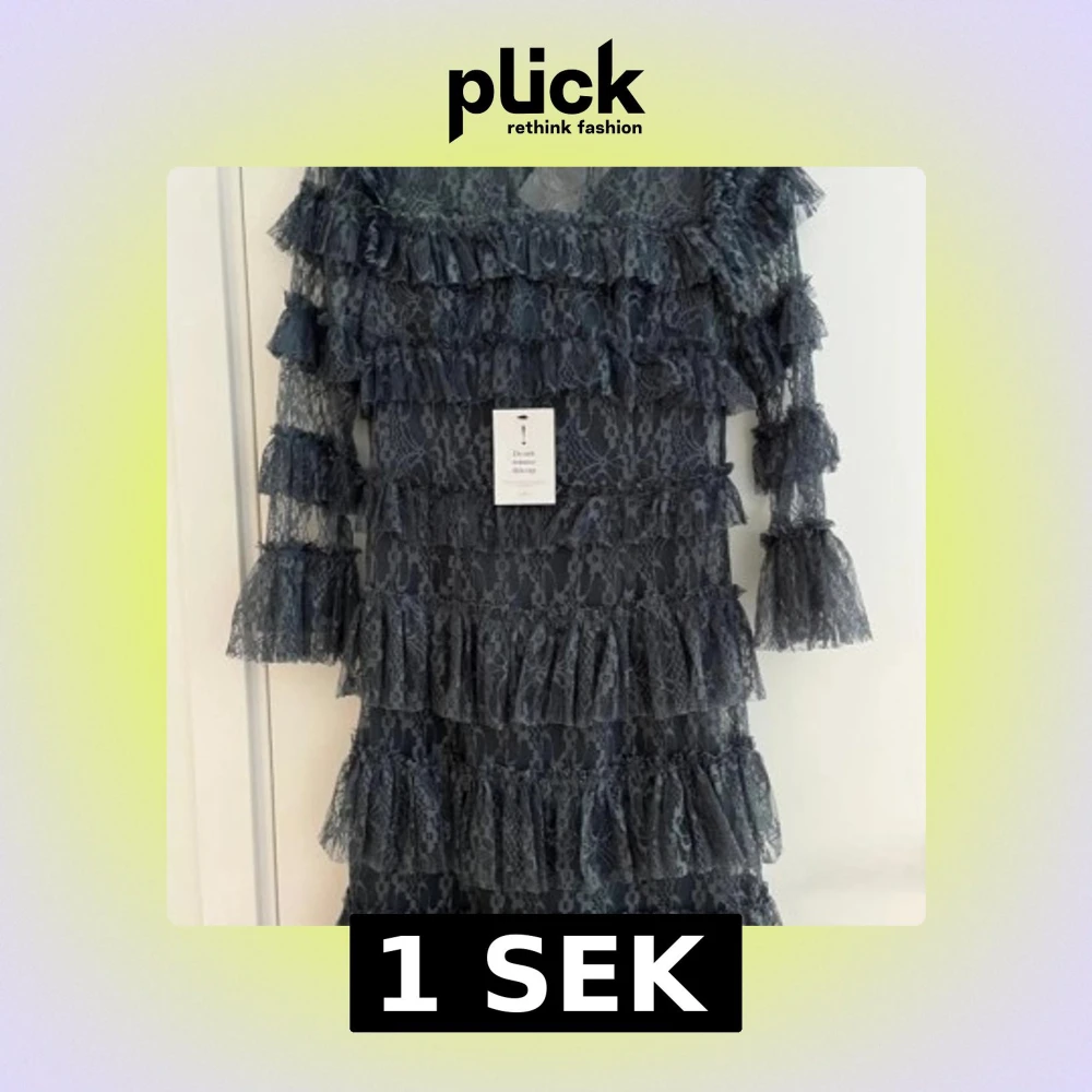 Supersnygg mörkblå klänning i spets med flera lager volanger. Klänningen har trekvartsärm och är perfekt för dig som vill sticka ut. Snygg och trendig modell som passar till många tillfällen.