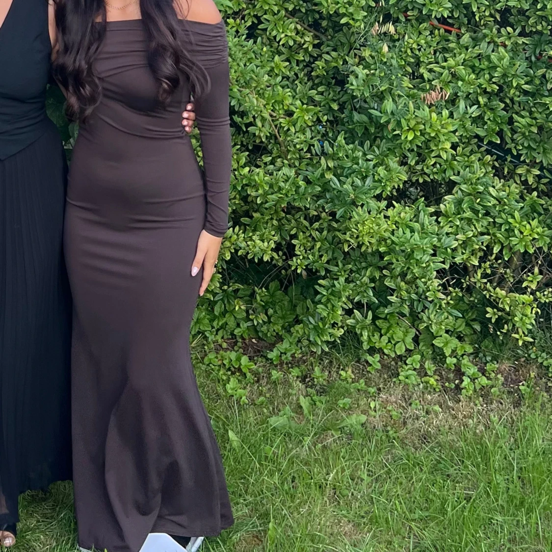 Säljer en elegant mörkbrun långklänning med offshoulder och långa ärmar. Klänningen har figurnära passform och är tillverkad i ett stretchigt material.