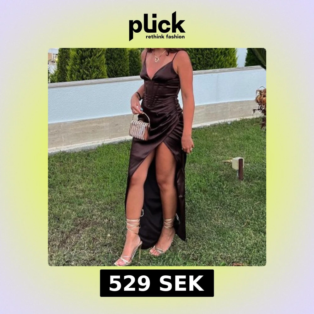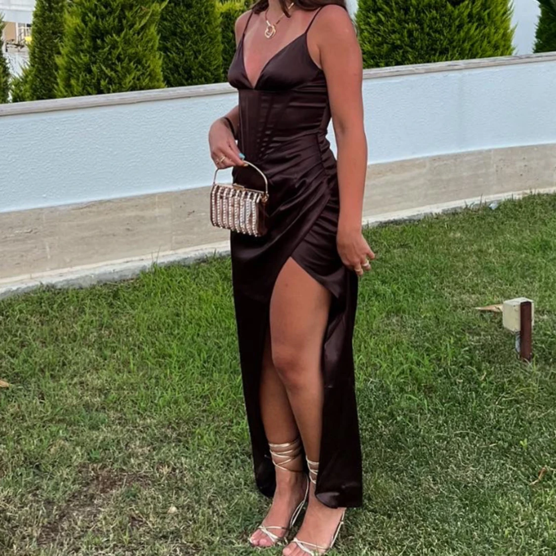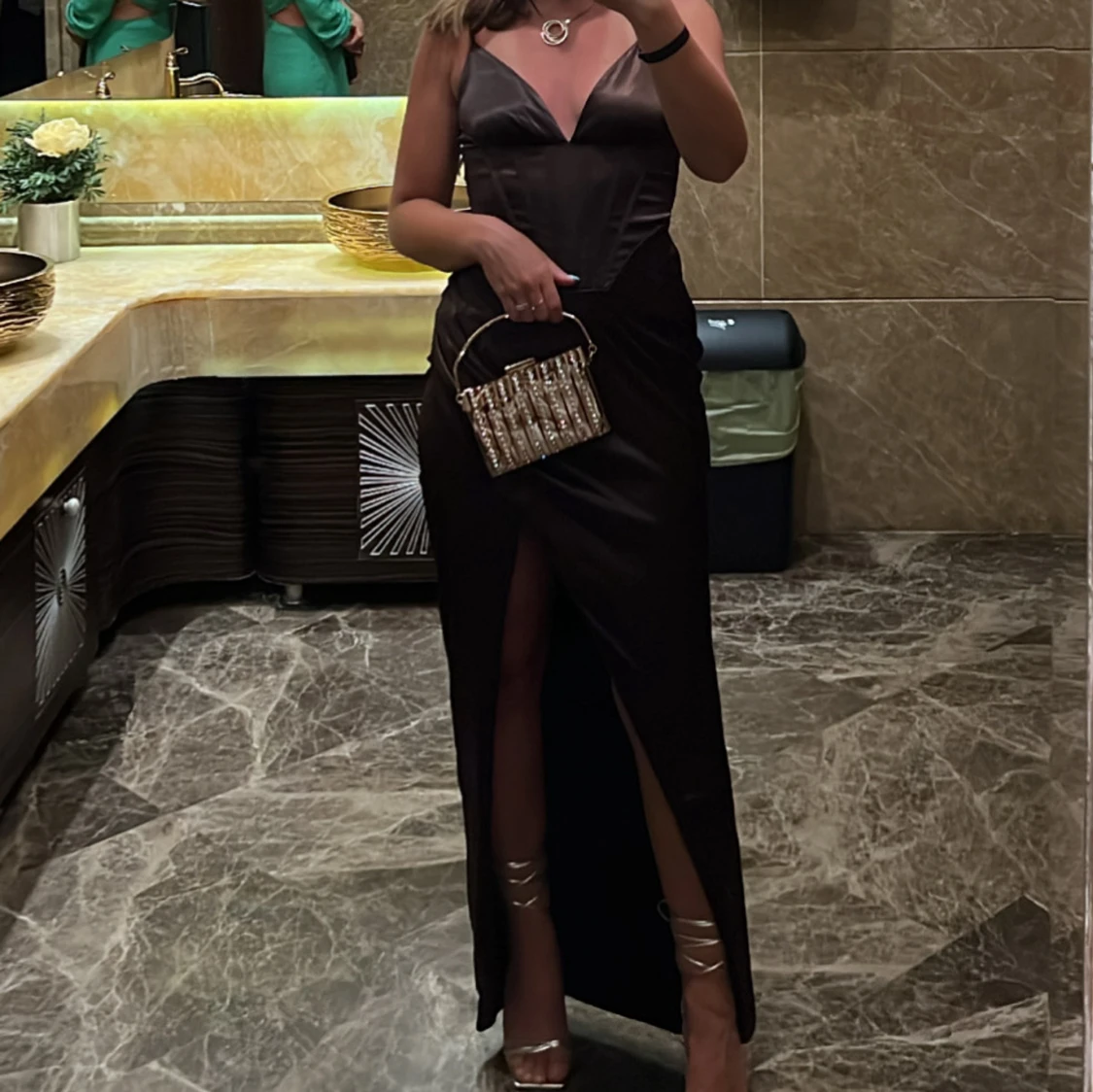 Snygg långklänning i mörkbrun satin med smala axelband och djup v-ringning. Klänningen har en hög slits framtill och figurnära passform som ger en elegant siluett. Perfekt för dig som vill sticka ut med en chic och trendig look.