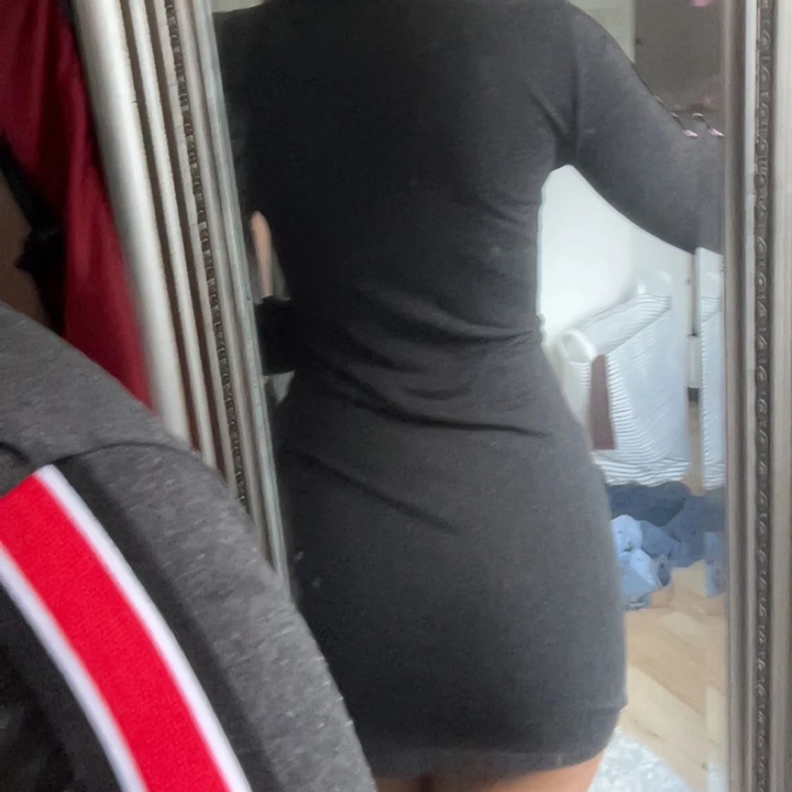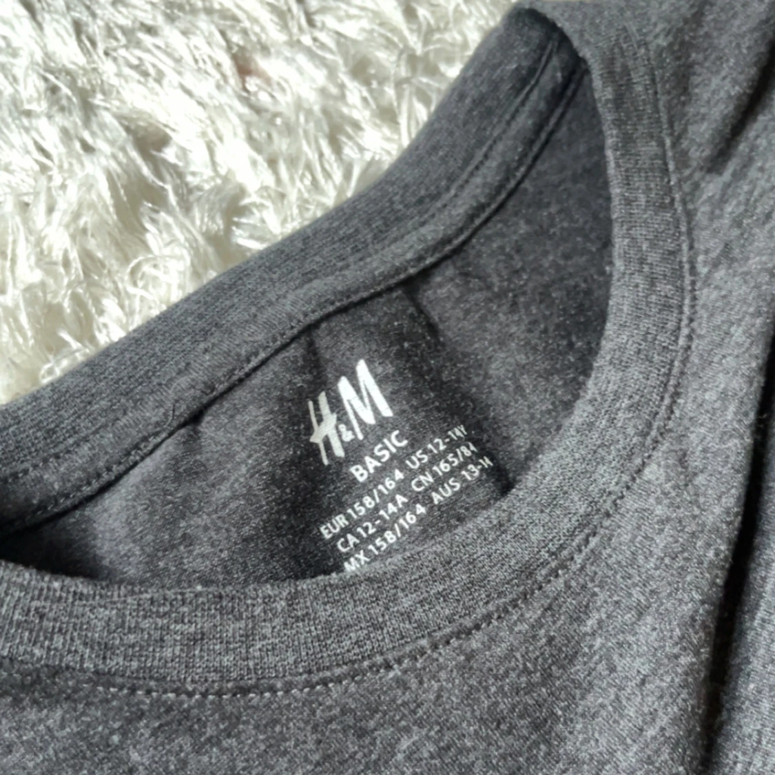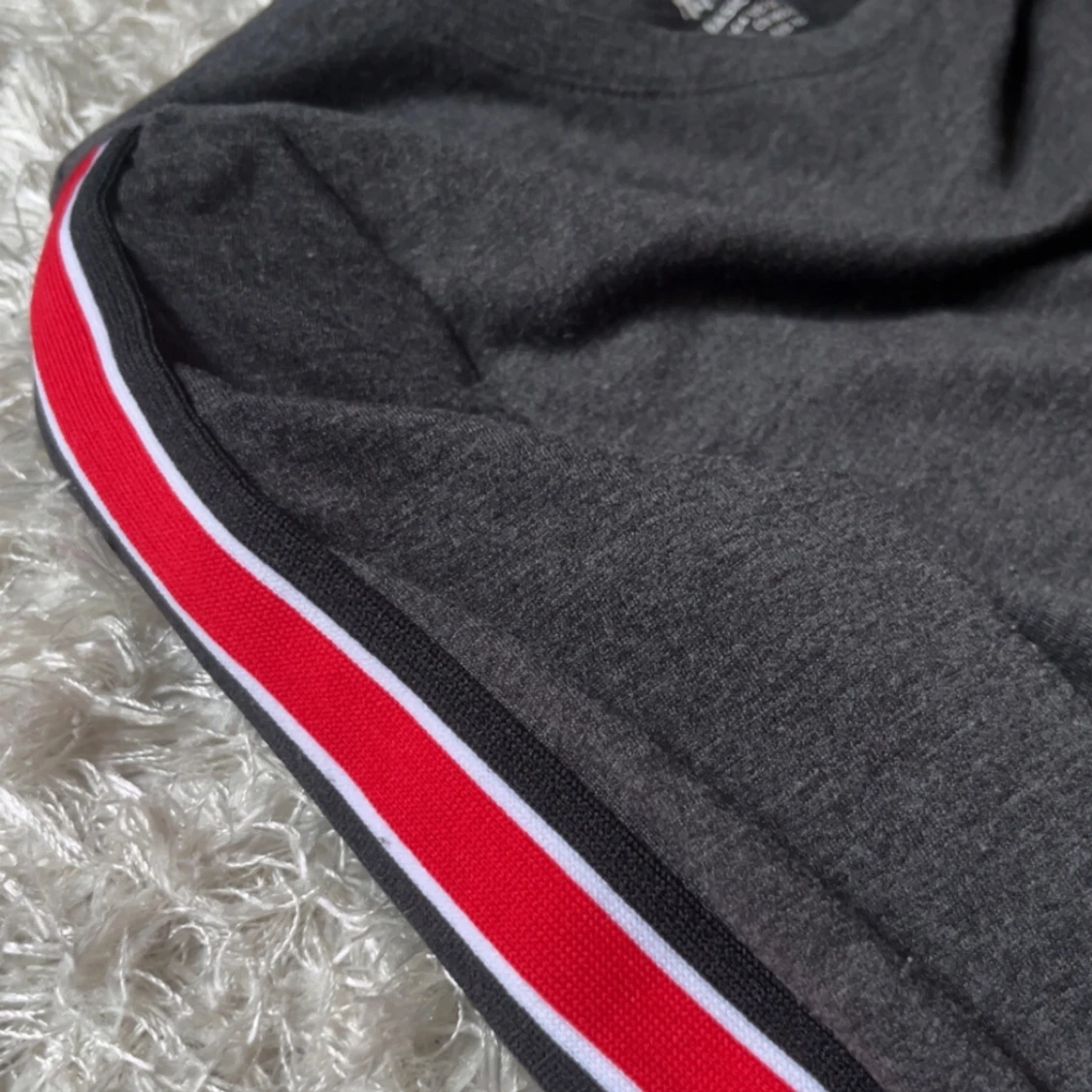 Tight mörkgrå kortklänning från H&M med långa ärmar och sportiga röda och vita ränder längs ärmarna. Enkel rund halsringning och mjukt bomullsmaterial som sitter snyggt på kroppen. Perfekt för en cool och avslappnad look.