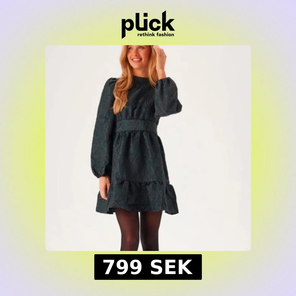 Nypris 900kr! Är i nyskick och prislapp är kvar! Elegant mörkgrön klänning med långa ärmar och volangdetaljer. Klänningen har en struktur med blommigt mönster och en markerad midja. Perfekt för höst och vinter!
