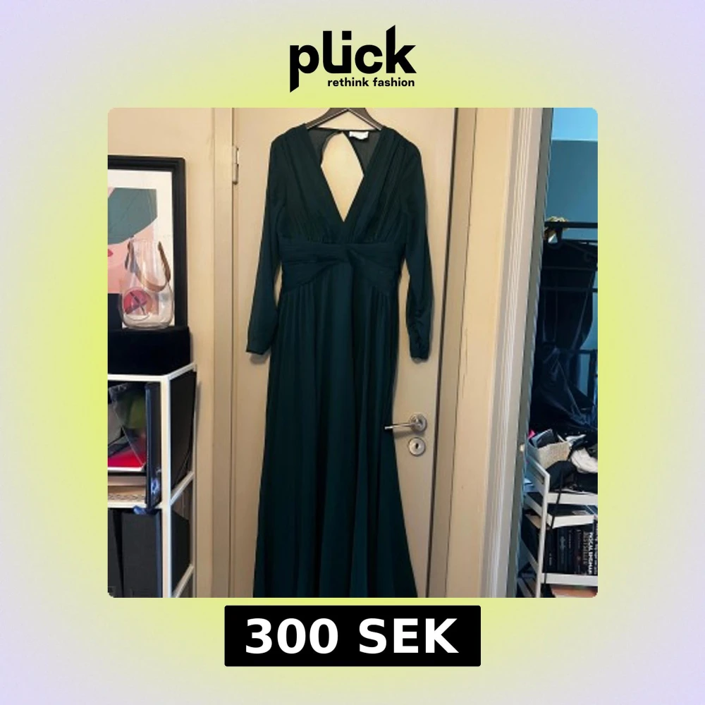 Säljer en elegant mörkgrön långklänning från ASOS DESIGN med djup v-ringning, långärmade ärmar med klädda knappar och öppen rygg. Klänningen har ett fint fall och markerad midja, perfekt för speciella tillfällen.