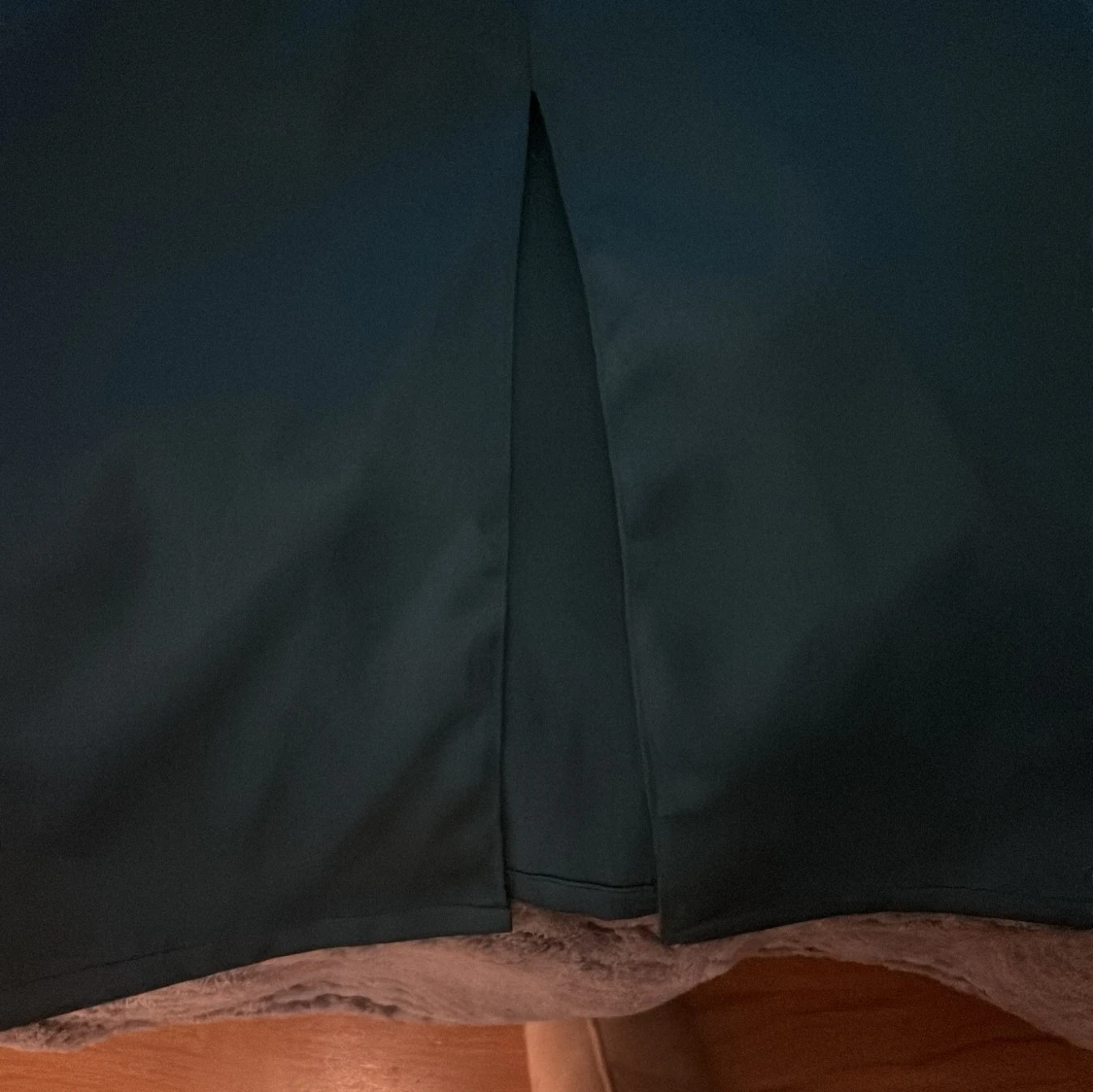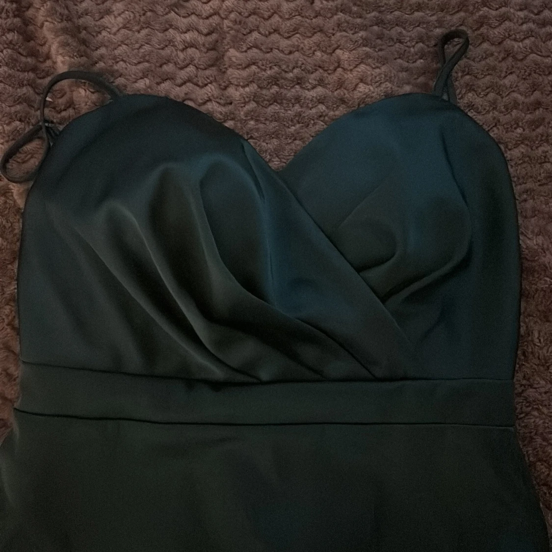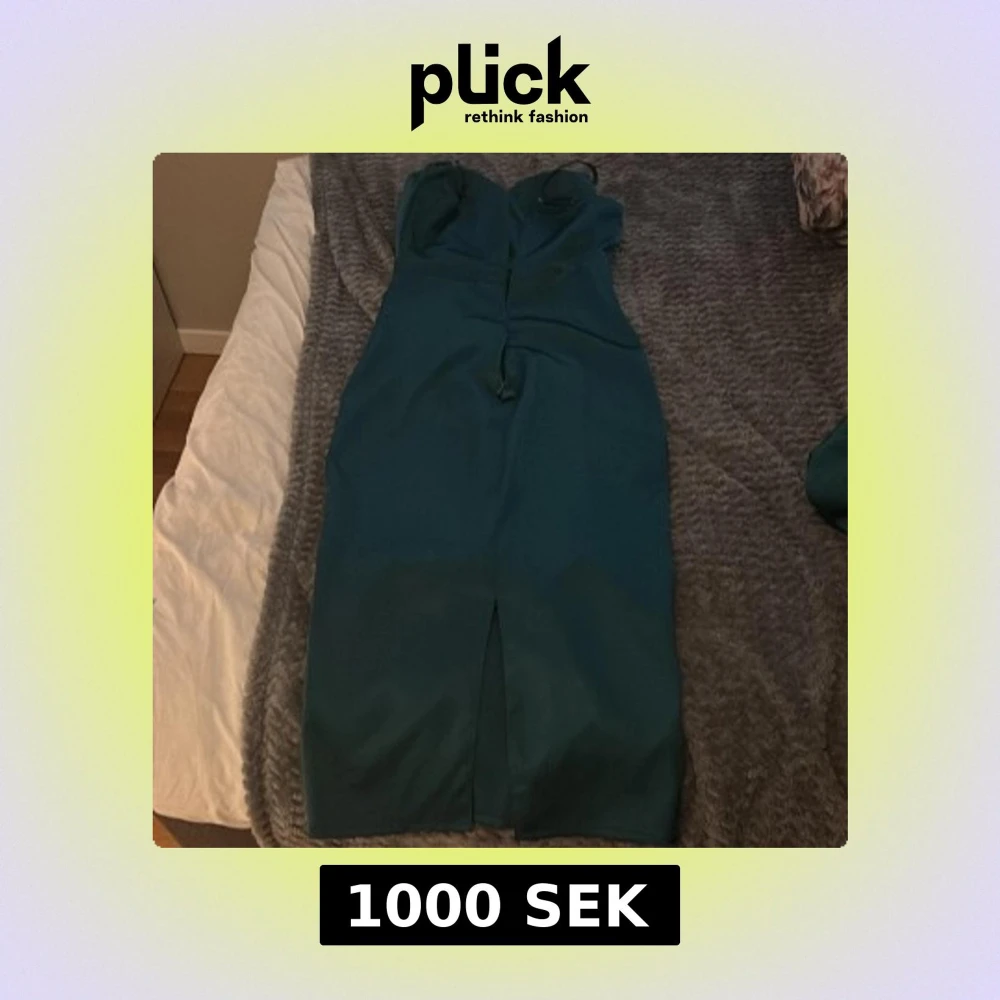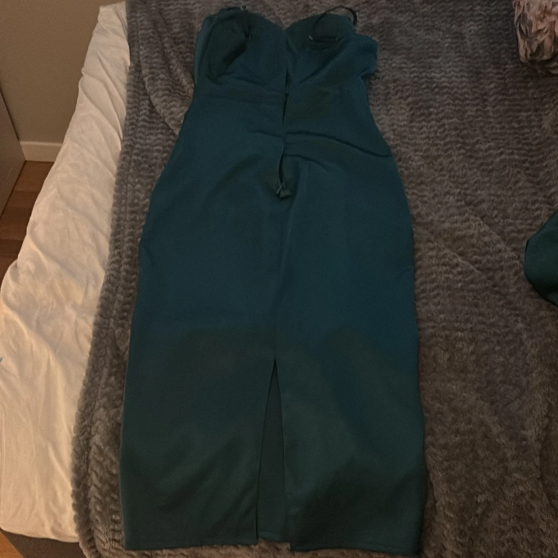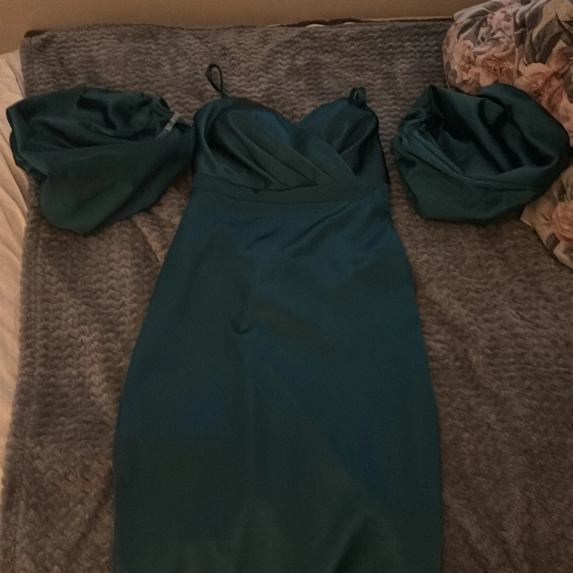 Snygg mörkgrön långklänning med smala axelband och v-ringad omlott upptill. Klänningen har en slits framtill och avtagbara puffärmar som ger en cool touch. Materialet är slätt och har en lätt satinliknande finish som känns lyxig.
