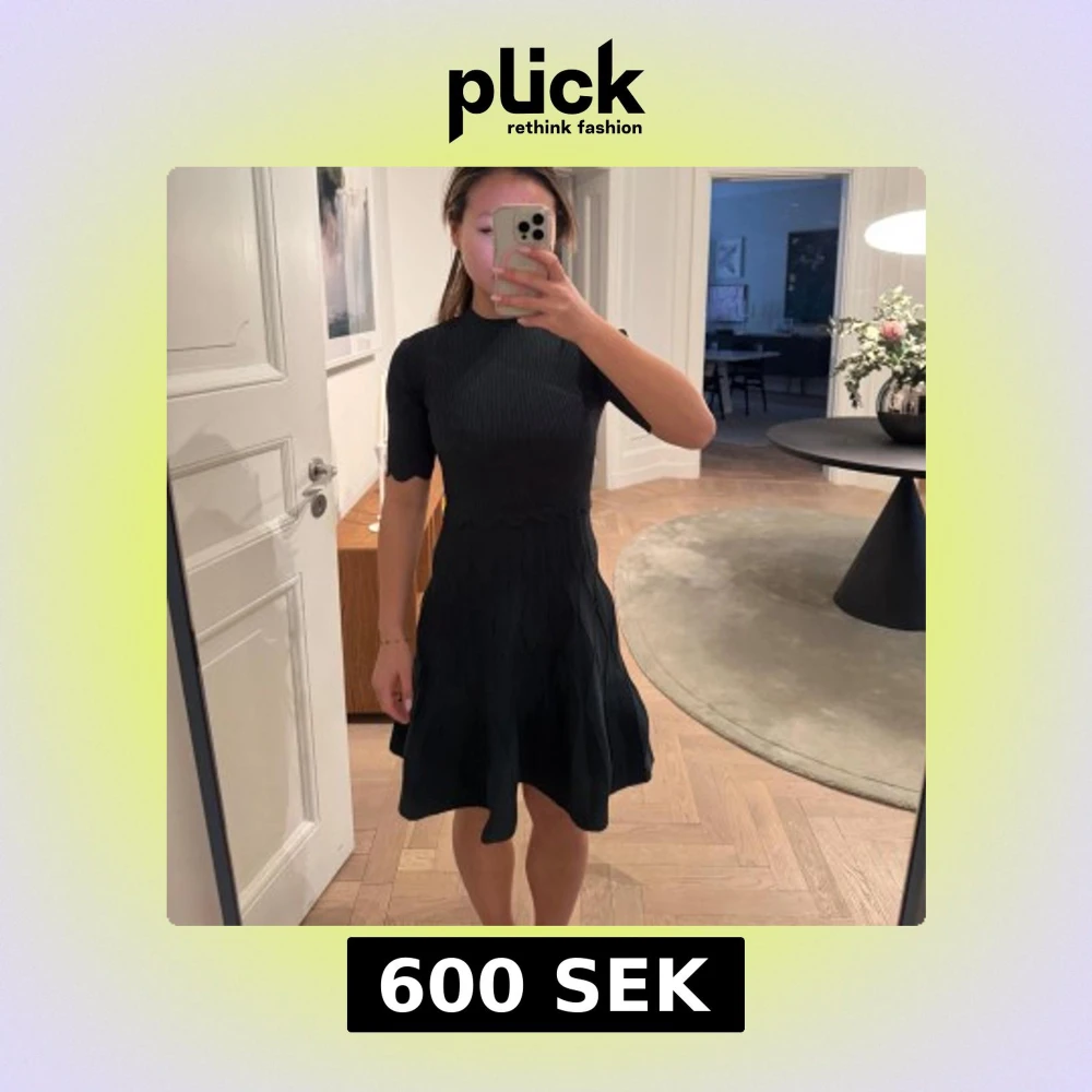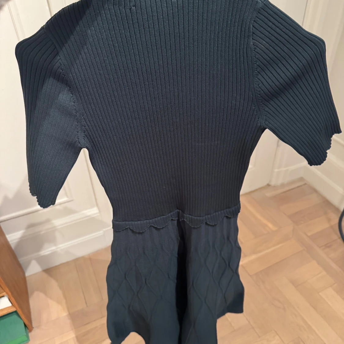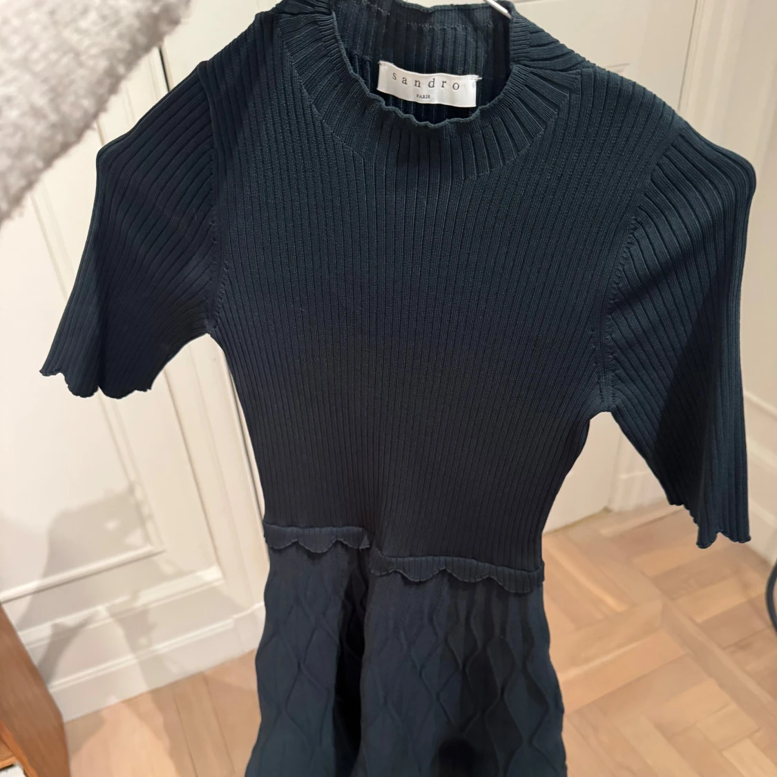 Snygg svart klänning från Sandro med ribbad överdel och korta ärmar. Kjolen har ett subtilt mönster och klänningen har en elegant passform som framhäver figuren. Perfekt för en stilren look.
