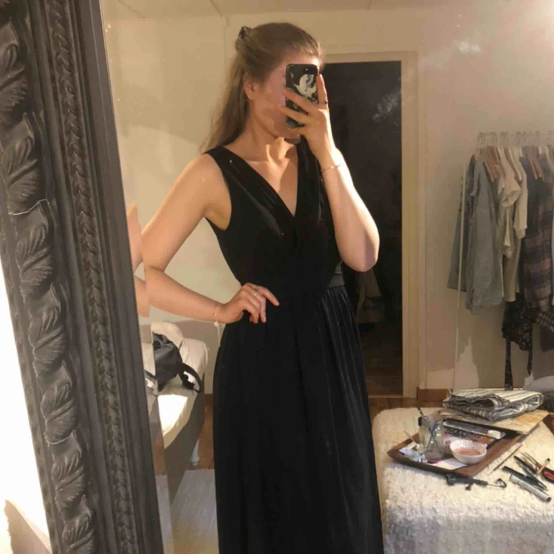 Svart lång ballklänning, använd en gång. Så den är i riktigt bra skick! Inköpspris från MQ 1499kr. Saknas en liten knapp där uppe men där är en till som håller det uppe fint! Skickar gärna fler bilder/video i bättre ljus! Frakten står köparen för :)