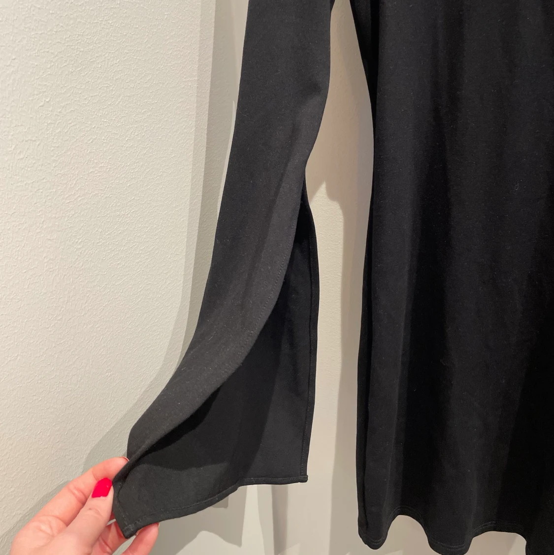 Snygg svart klänning med slits längst ner på ärmen. Den har även en lite högre krage. Ger en väldigt fin figur!