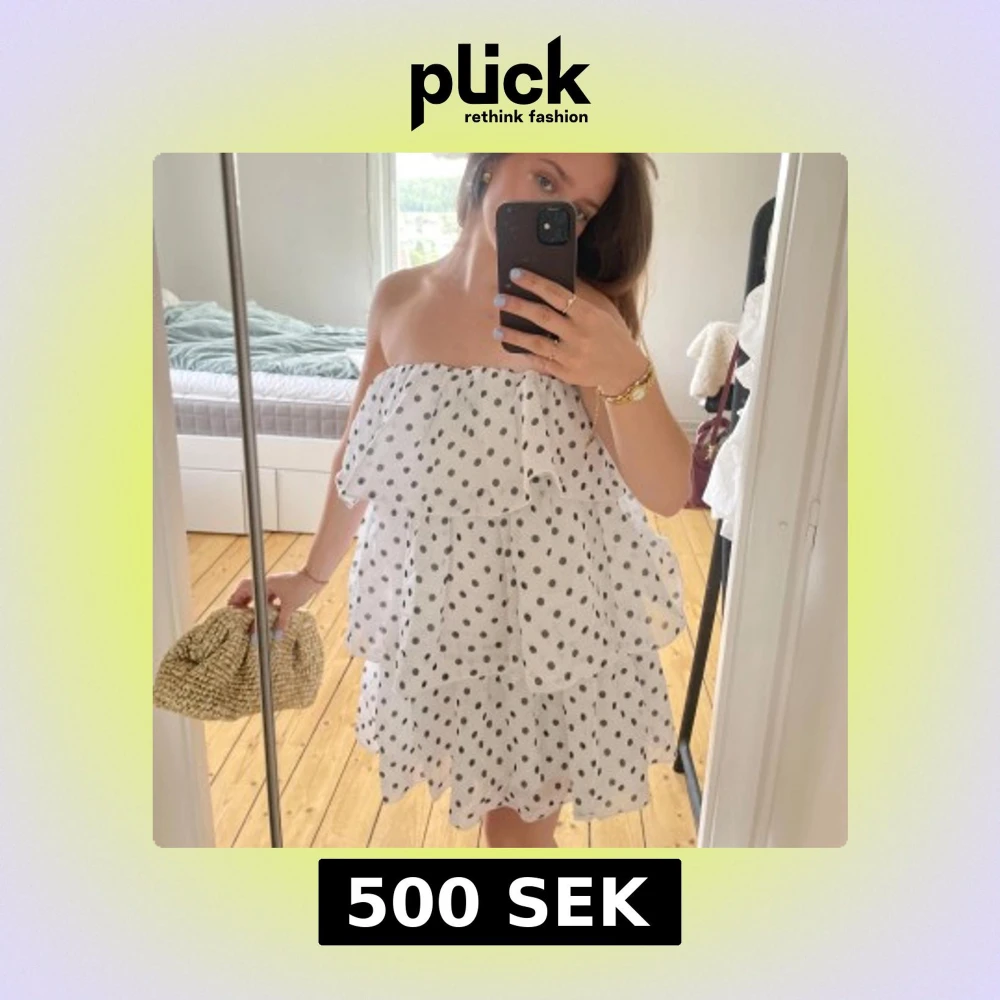 Superfin vit kort klänning med svarta prickar och flera lager volanger. Axelbandslös modell som ger en chill och somrig vibe. Perfekt för dig som gillar att sticka ut med ett lekfullt mönster. Lätt och luftig, passar perfekt till varma dagar.