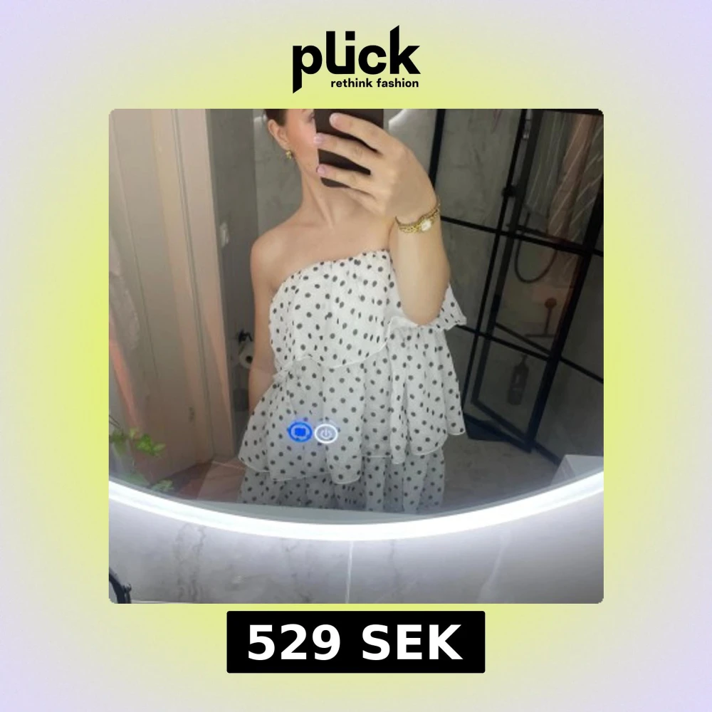 Säljer en superfin vit kortklänning med svarta prickar och volanger. Klänningen är axelbandslös och har en luftig, flowy passform med lager på lager-effekt. Perfekt för dig som gillar en lekfull och trendig stil. Materialet känns lätt och svalt.passar xs