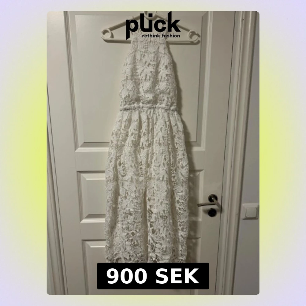 Superfin vit långklänning med blommig spets och tunna axelband som korsas i ryggen. Klänningen har öppen rygg och ett elegant fall. Perfekt för studenten