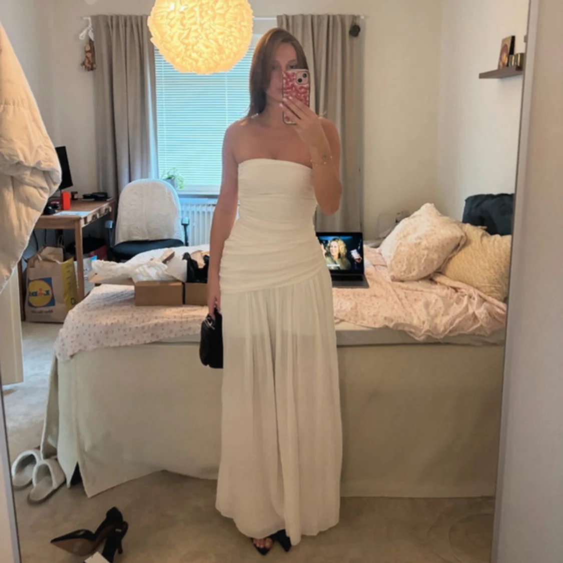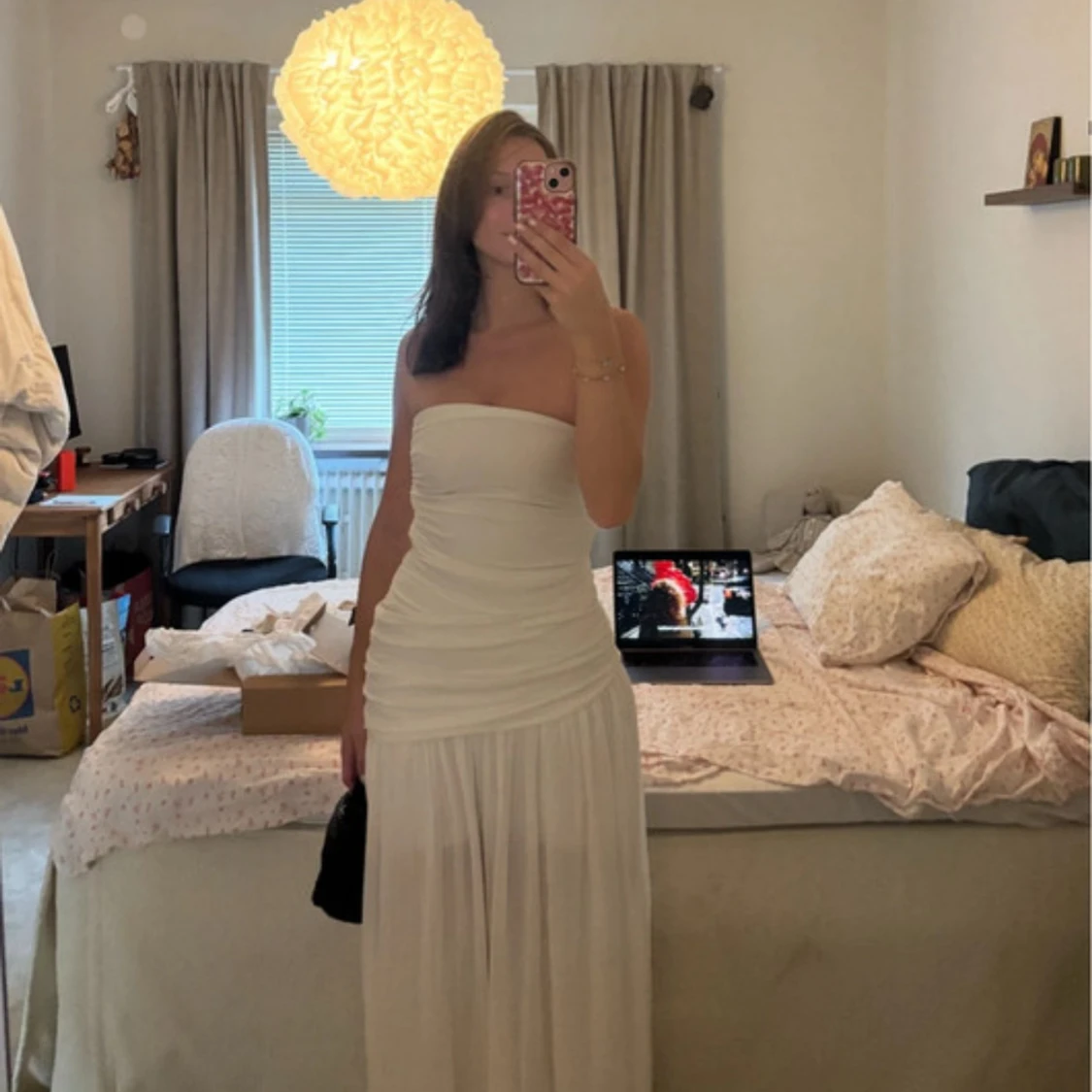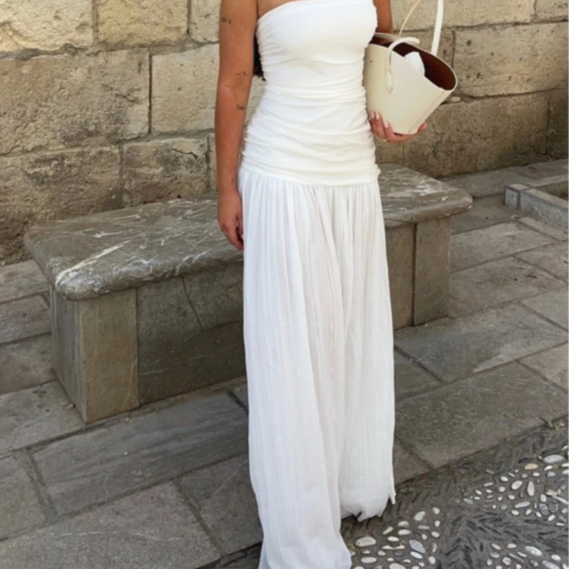 Säljer en superfin vit långklänning med axelbandslös design och rynkade detaljer över byst och midja. Kjolen är lätt och faller snyggt, perfekt för sommarens alla tillfällen. Klänningen har en clean och stilren look som känns både trendig och tidlös. Nypris 899