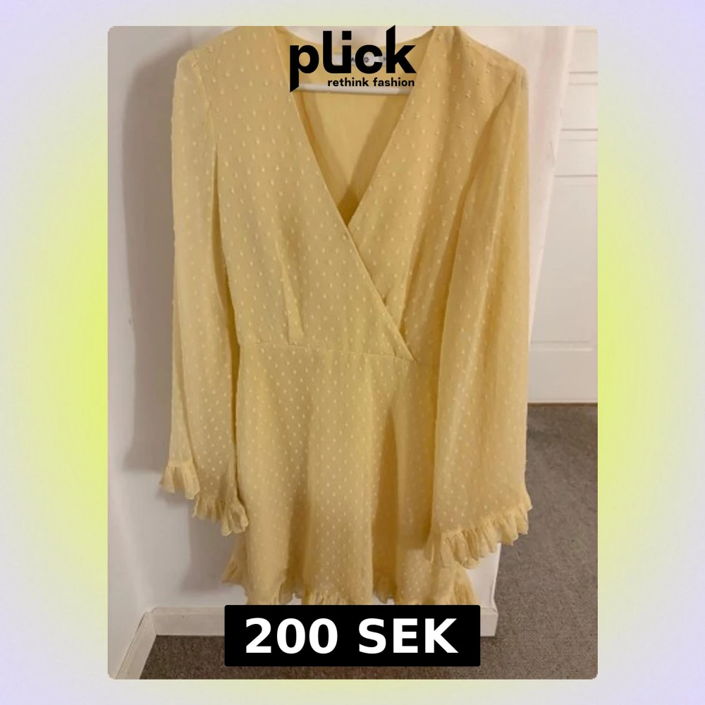 Söt ljusgul kortklänning från NA-KD med omlottmodell och v-ringning. Klänningen har långärmade ärmar med volangdetaljer vid ärmslut och nederkant samt diskret prickigt mönster. Perfekt för vår och sommar!