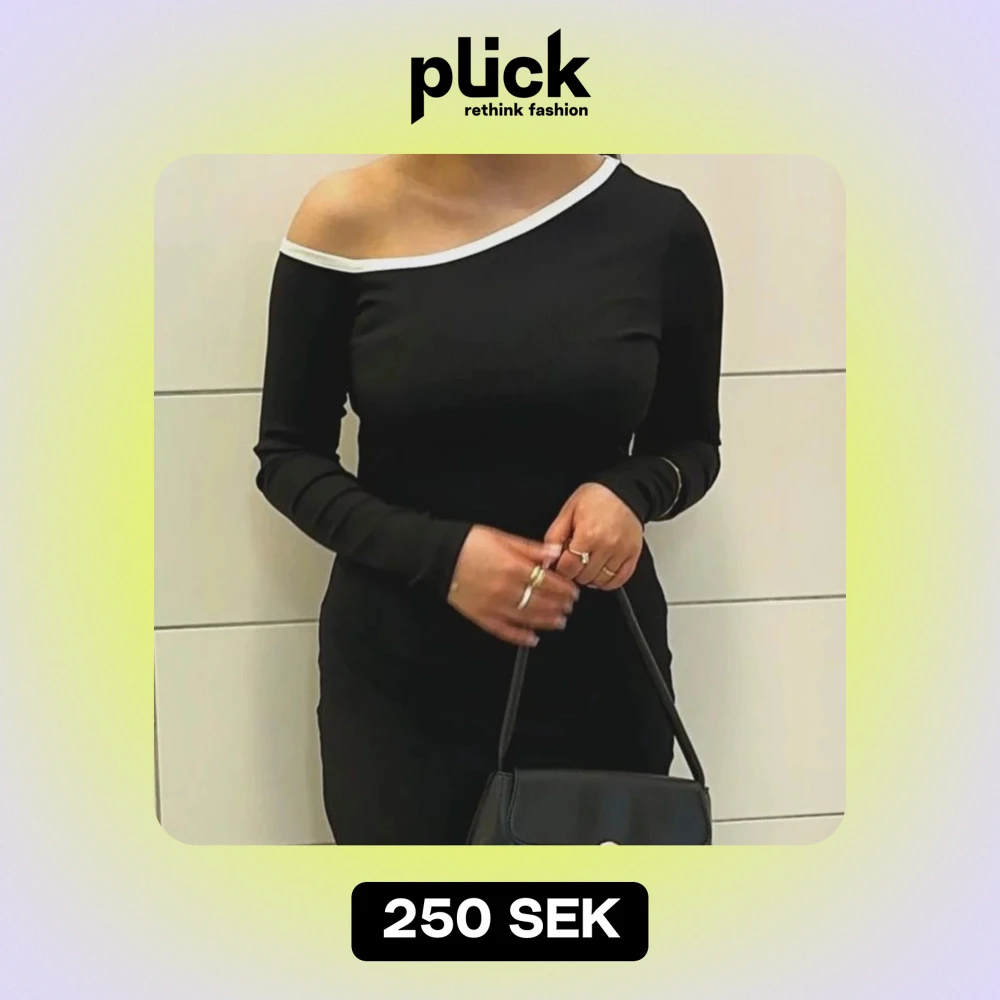 Snygg svart offshoulder klänning med vit kantdetalj. Perfekt för festliga tillfällen. Klänningen har en tight passform och långa ärmar, vilket ger en elegant look. Materialet ser ut att vara mjukt och stretchigt för en bekväm känsla. Klänningen är från NAKD