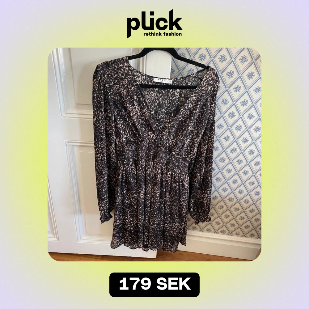 Snygg mönstrad klänning från NA-KD i storlek 36. Den har en v-ringad design med långa ärmar och ett elastiskt midjeband för en smickrande passform. Perfekt för både vardag och fest!
