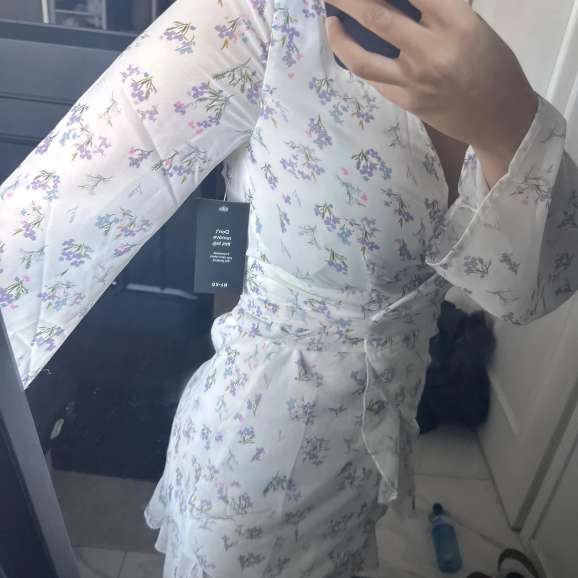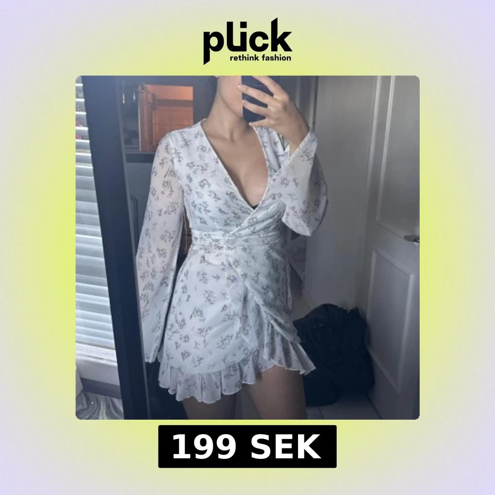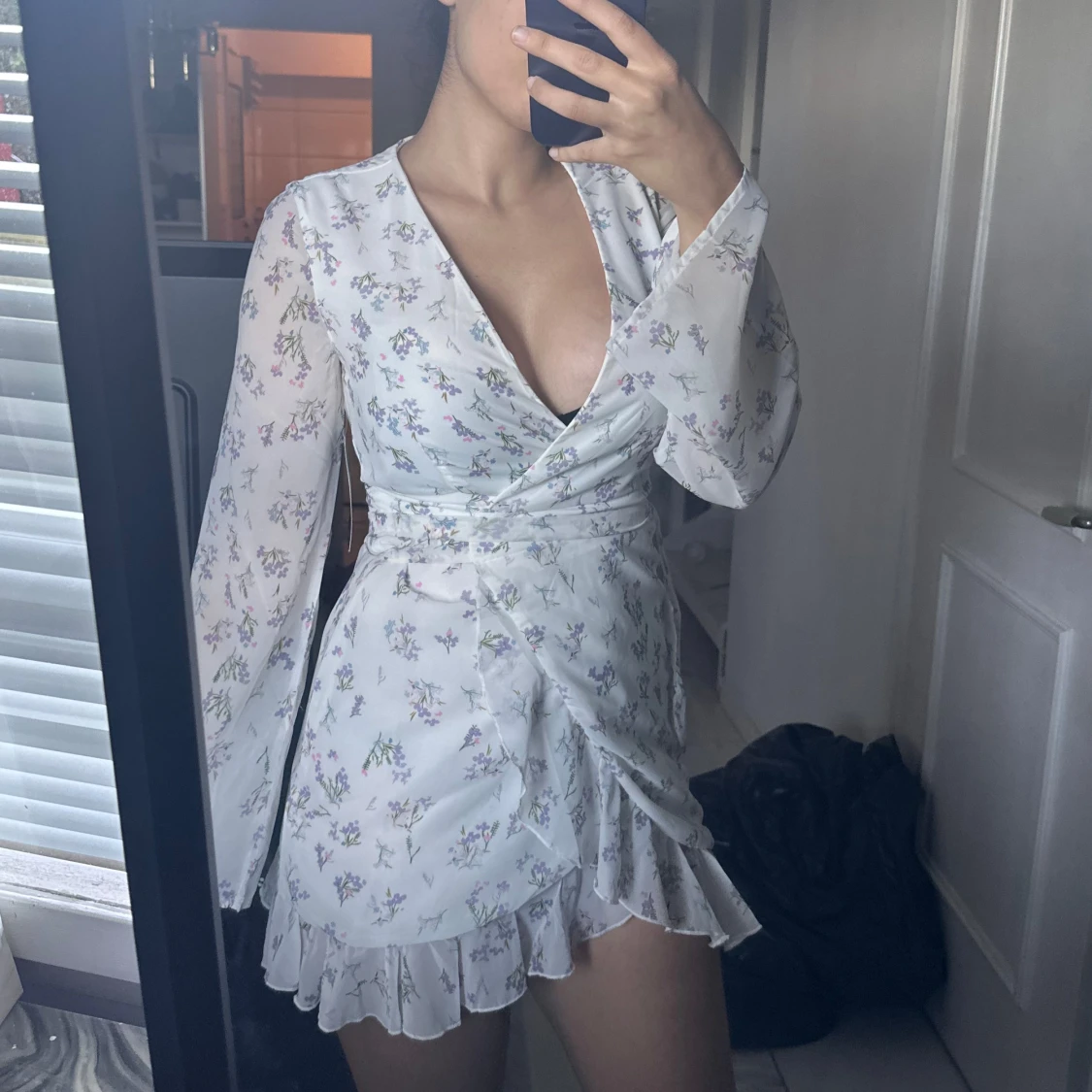 Supersöt vit omlottklänning från NA-KD med blommigt mönster i lila, grönt och rosa. Klänningen har långa, vida ärmar, v-ringning och volangkant nertill. Perfekt för sommarens alla tillfällen!
