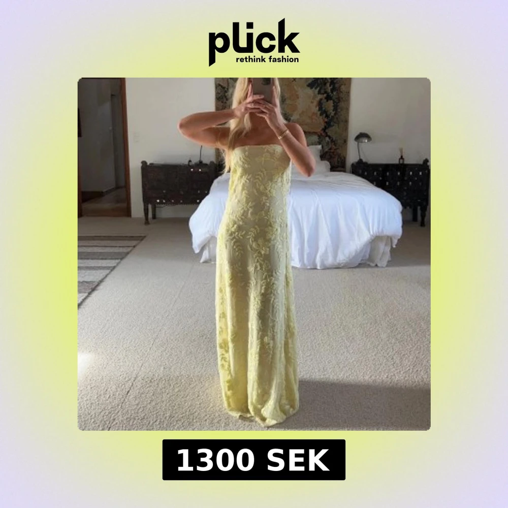 Elegant smör-gul axelbandslös långklänning med broderat blommigt mönster. Perfekt som balklänning eller till midsommar/bröllopsgäst. Klänningen har en smickrande passform och är tillverkad i ett lätt och luftigt material. Slutsåld på hemsidan!💛💛