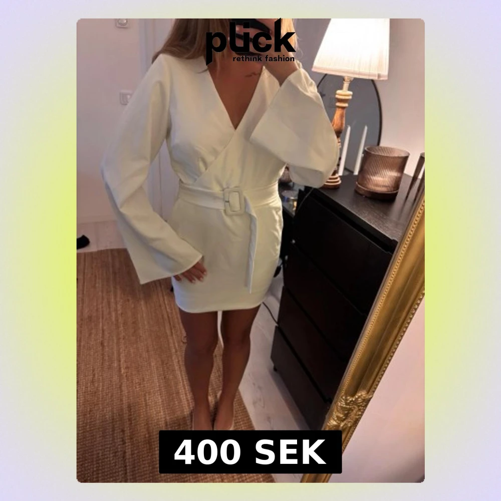 Perfekt klänning som funkar till student. En storlek för stor för mig, därför ser den lite pösig ut vid bysten. Bandet är justerbart. Ej genomskinlig. Inte struken på bild. En liten fläck vid bandet men inget som läggs märke till, kan även täckas av bältet.( sista bilden) I en gräddvit färg!