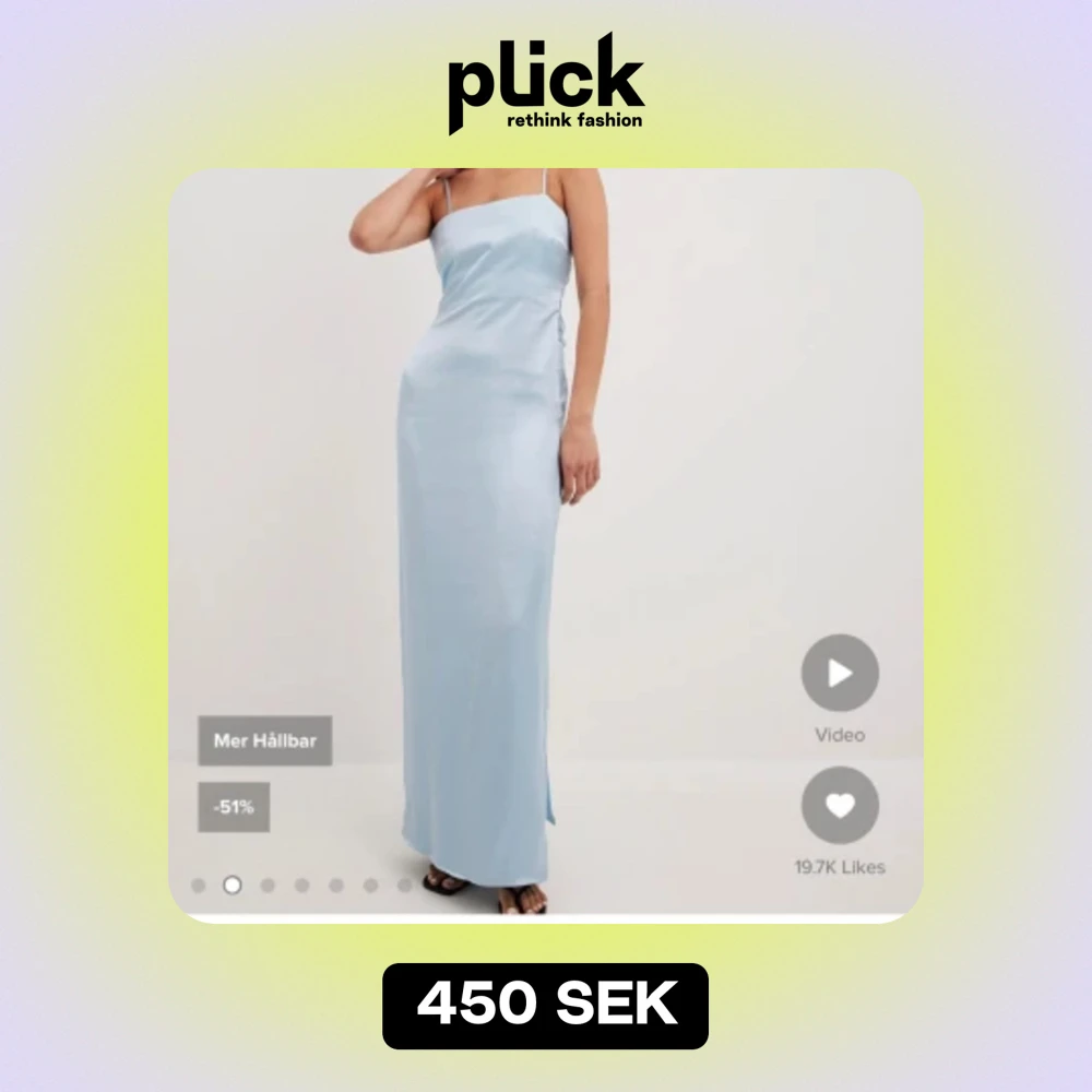 En lång ljusblå sidenklänning med öppen rygg. Aldrig använd. Stl 38, går precus till över fötterna på mig som är 175 cm. Helt slutsåld på nätet!
