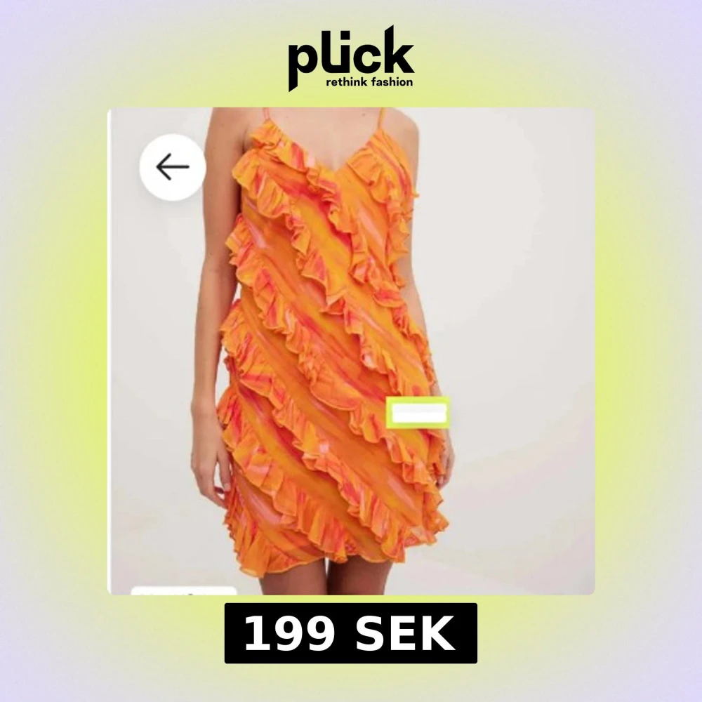 Superfin kort klänning i orange och rosa toner med smala axelband och massor av volanger i diagonala rader. Sval och lätt, perfekt för sommarens alla tillfällen. V-ringad framtill och med ett färgglatt mönster som verkligen sticker ut