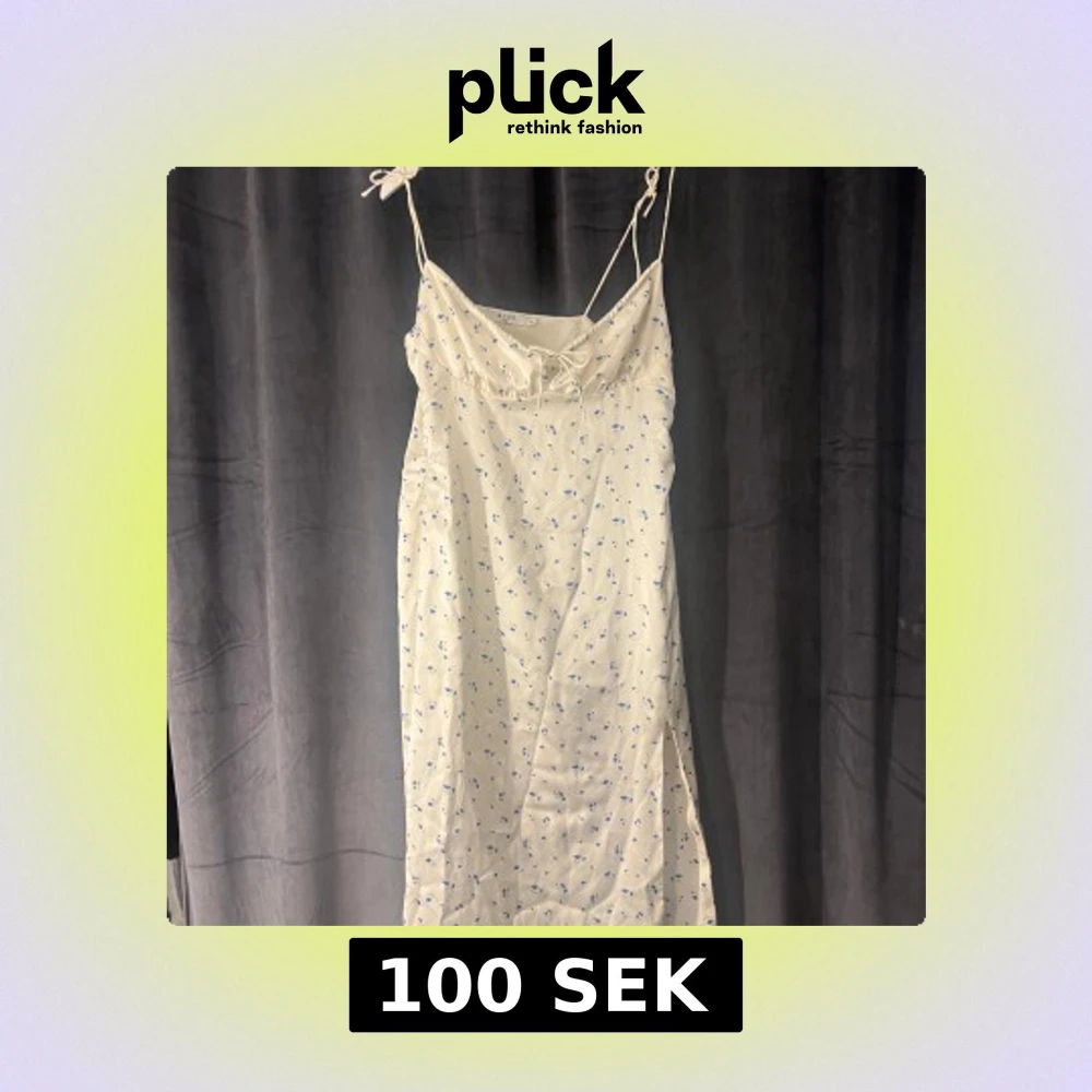 vit klänning från NA-KD med blått blommönster. Klänningen har smala axelband och knytning framtill. Slits på sidan.