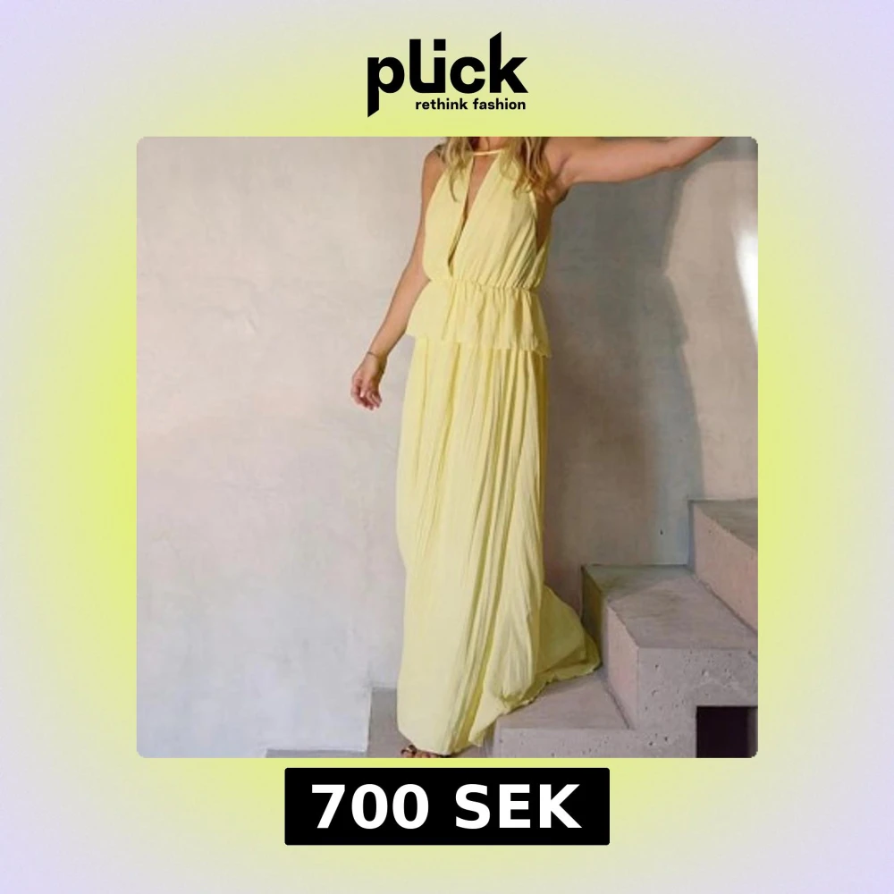Helt ny, oanvänd (prislapp kvar). Superfin ljusgul långklänning med djup v-ringning och ärmlös design. Klänningen har ett flowy fall och markerad midja med volangdetalj. Perfekt för sommarens alla tillfällen när du vill känna dig extra chic.