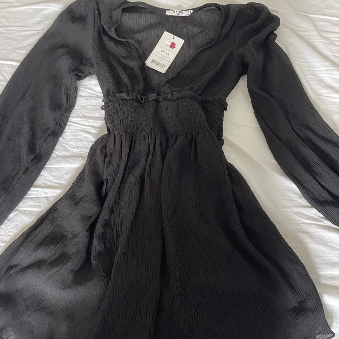 Supersnygg svart klänning från NA-KD med smockad midja och v-ringning. Nypris är 499kr! Aldrig använd med prislappen kvar!
