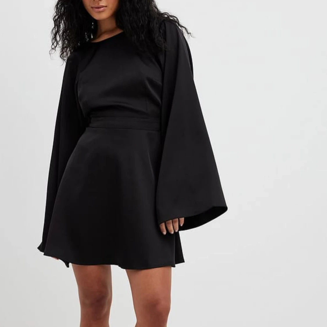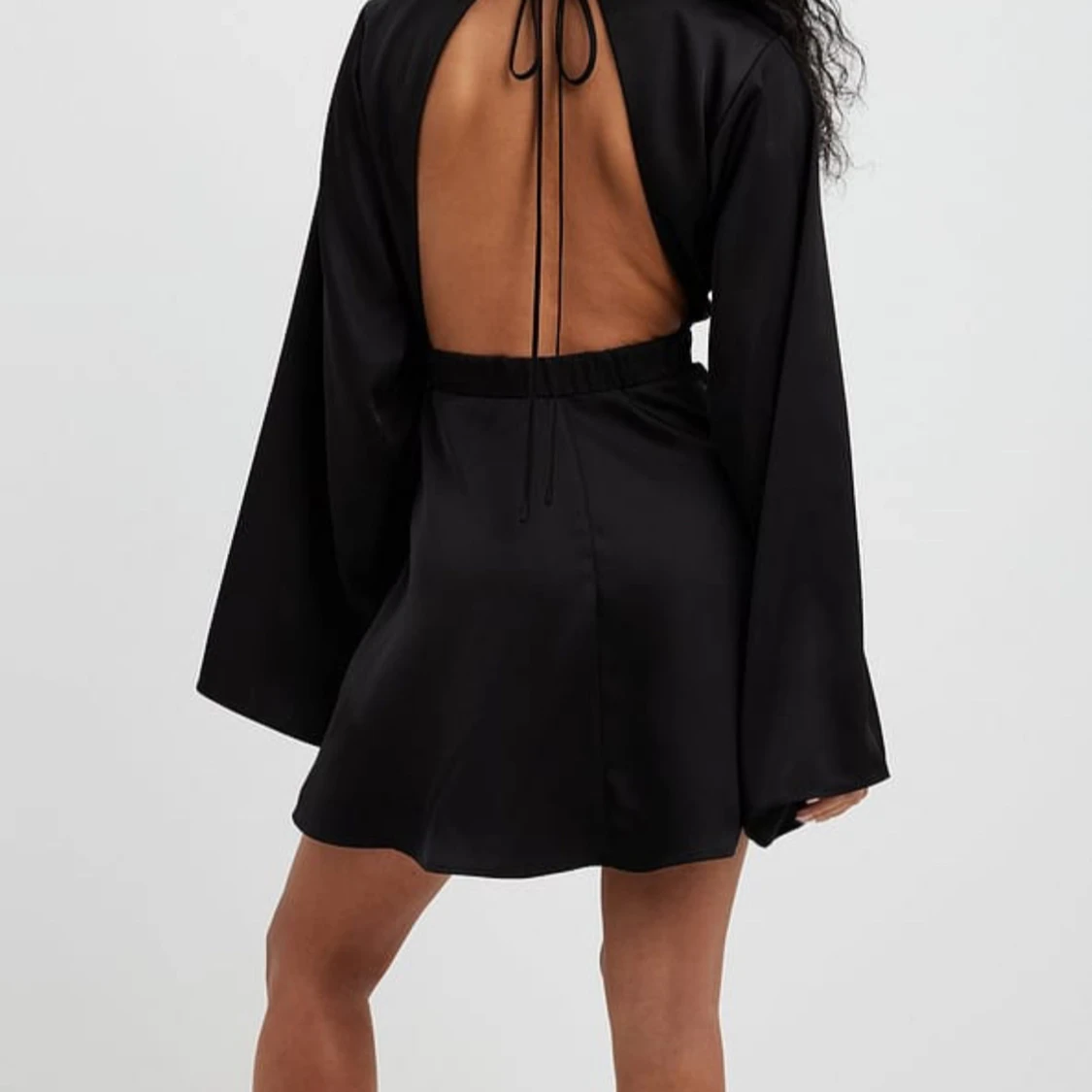 Supersnygg svart kort klänning med vida ärmar och öppen rygg som knyts med tunna band. Klänningen har en lätt glansig finish och markerad midja, vilket ger en elegant och trendig look. Perfekt för dig som vill sticka ut med stilrena detaljer. Helt ny med prislapp kvar, aldrig använd !
