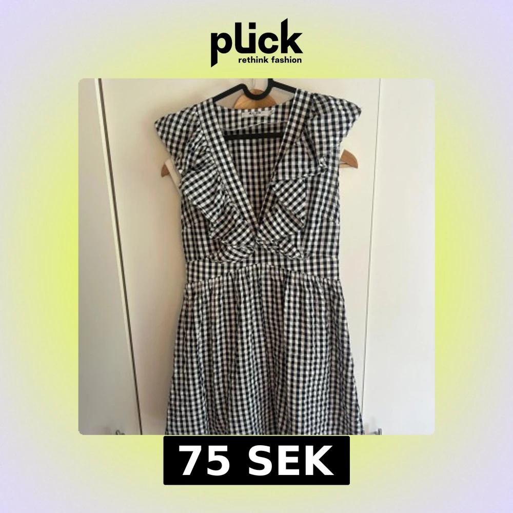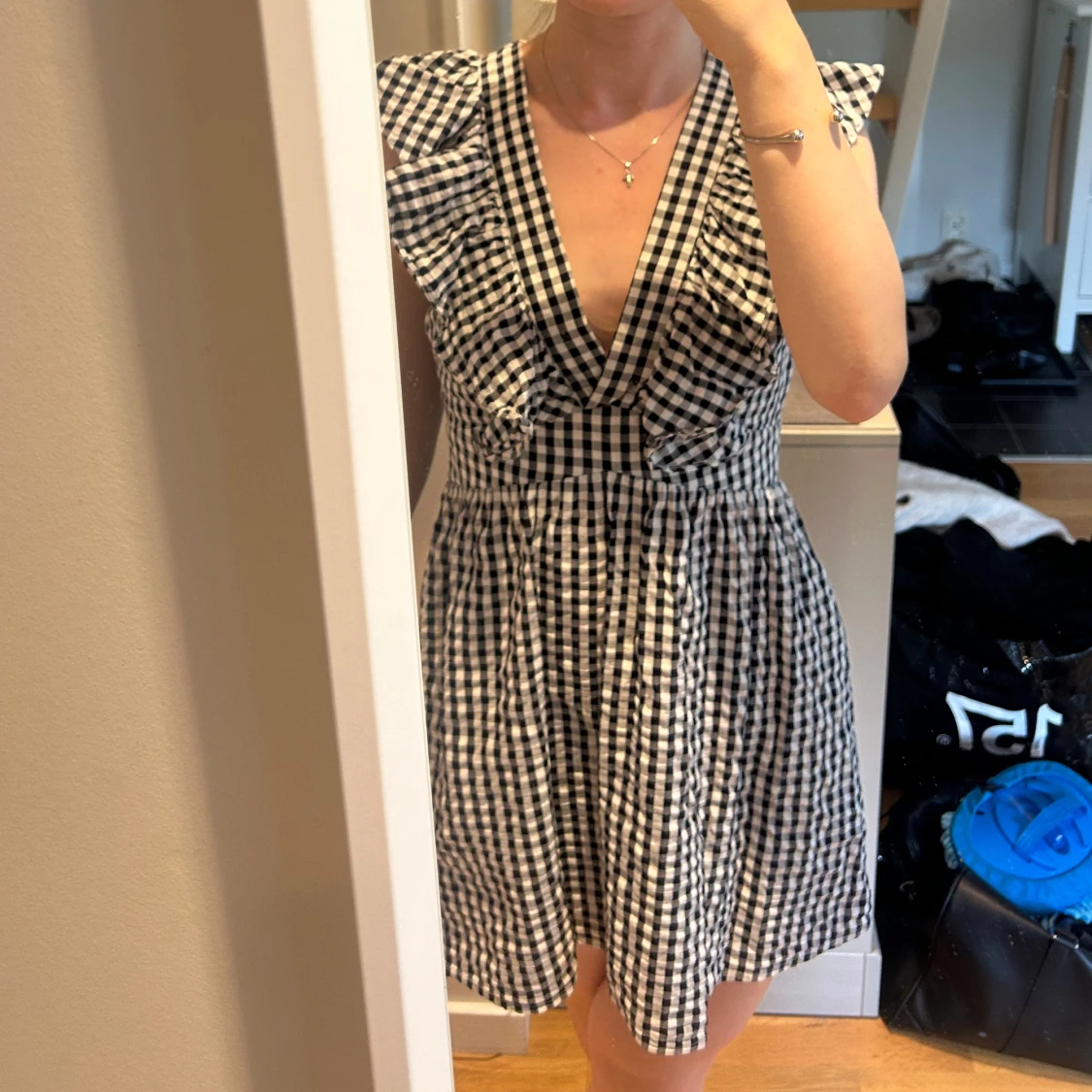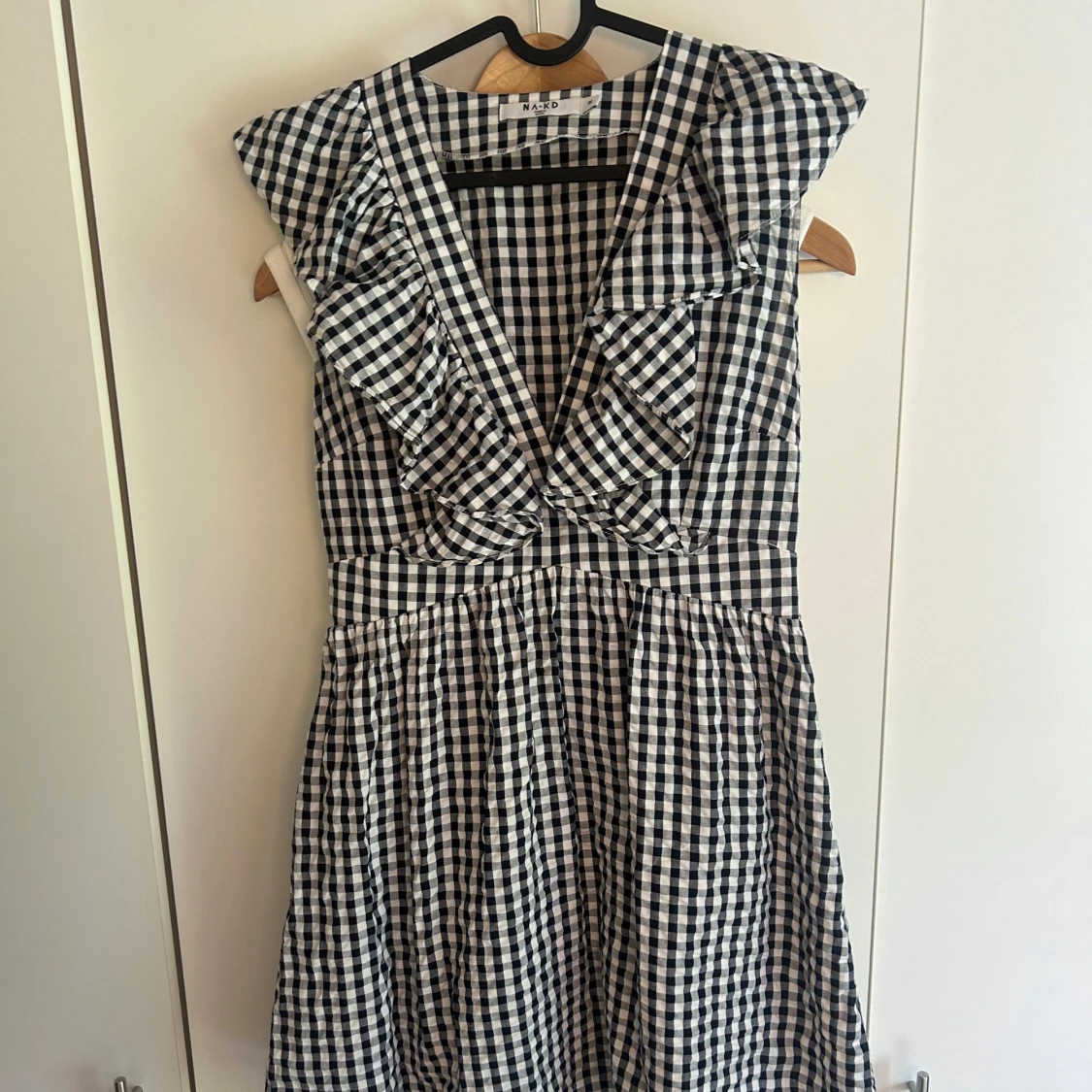 Supersöt kort klänning från NA-KD med svartvitt rutigt mönster, djup v-ringning och volangdetaljer vid axlarna. Klänningen är ärmlös och har en markerad midja som ger en fin siluett. Perfekt för dig som gillar en lekfull och trendig stil.