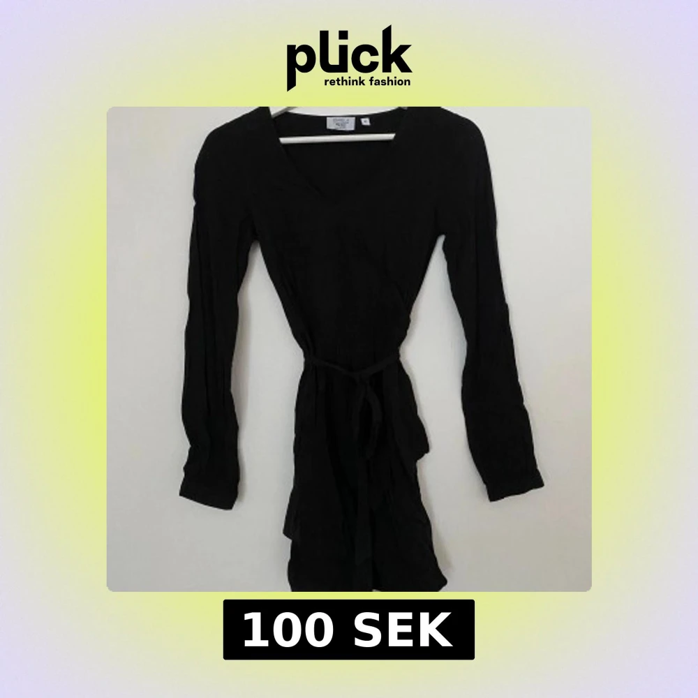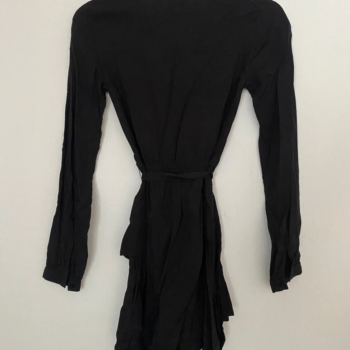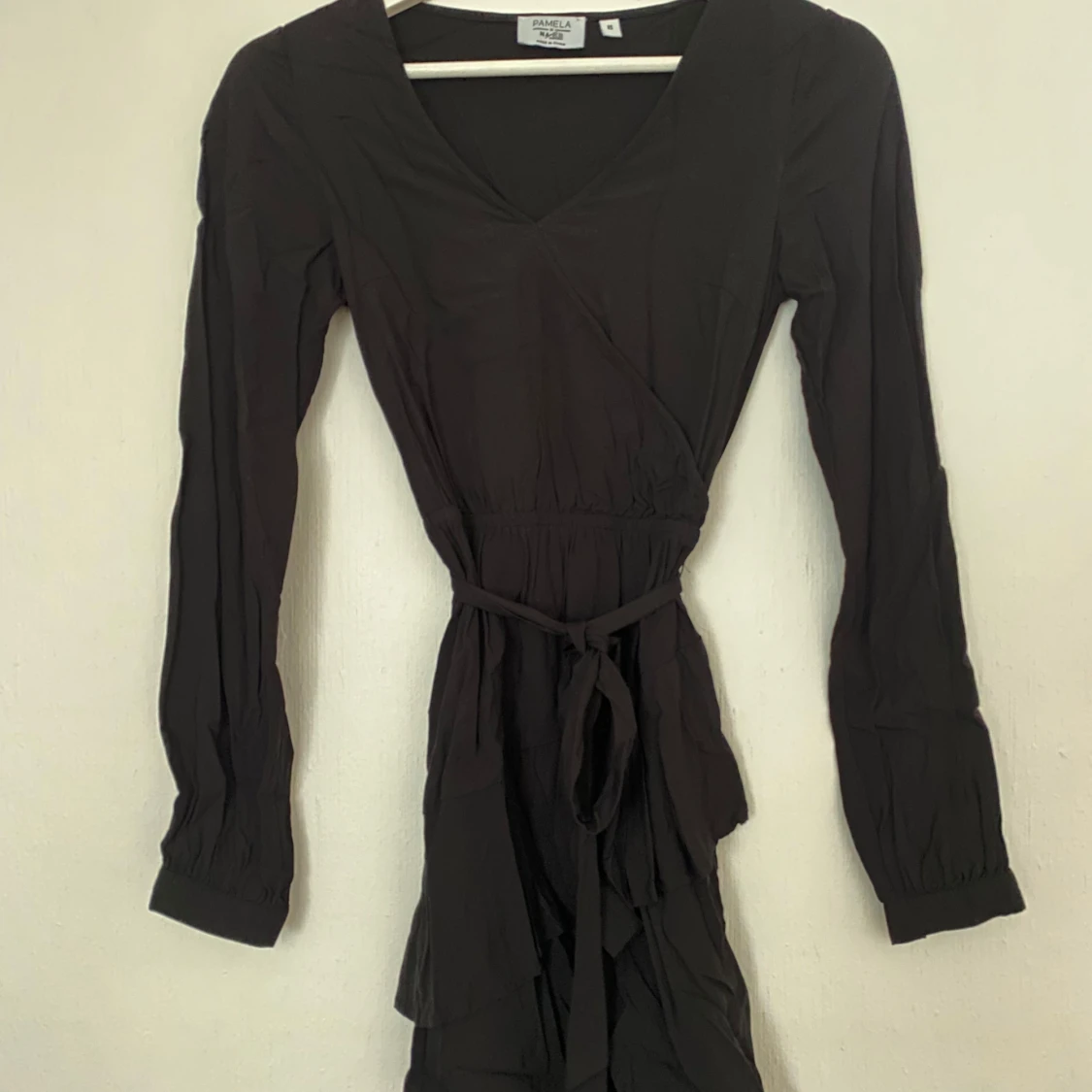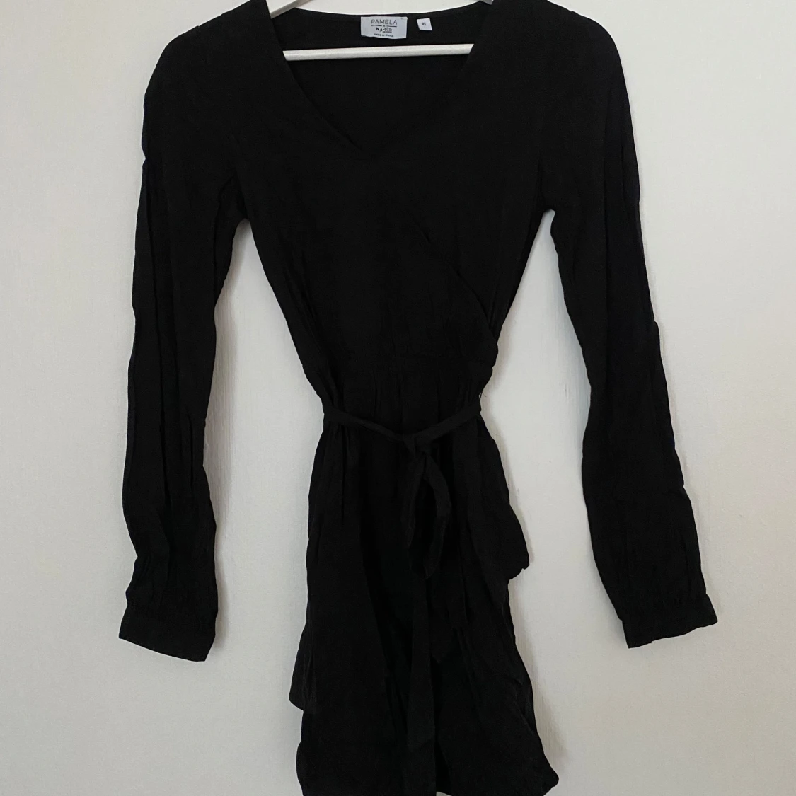 Säljer en svart omlottklänning från NA-KD x Pamela i storlek 32. Klänningen har lång ärm, v-ringad hals och knytband i midjan för en snygg siluett. Materialet är mjukt och lätt.