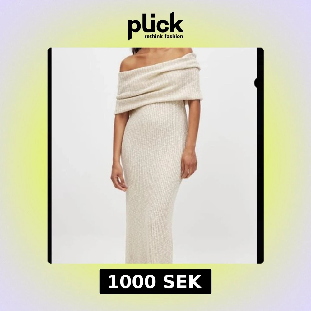 Superfin beige långklänning i ribbat stickat material med offshoulder och figurnära passform. Klänningen har en bred krage som vilar över axlarna och ger en elegant look. Perfekt för dig som vill ha något stilrent och trendigt.