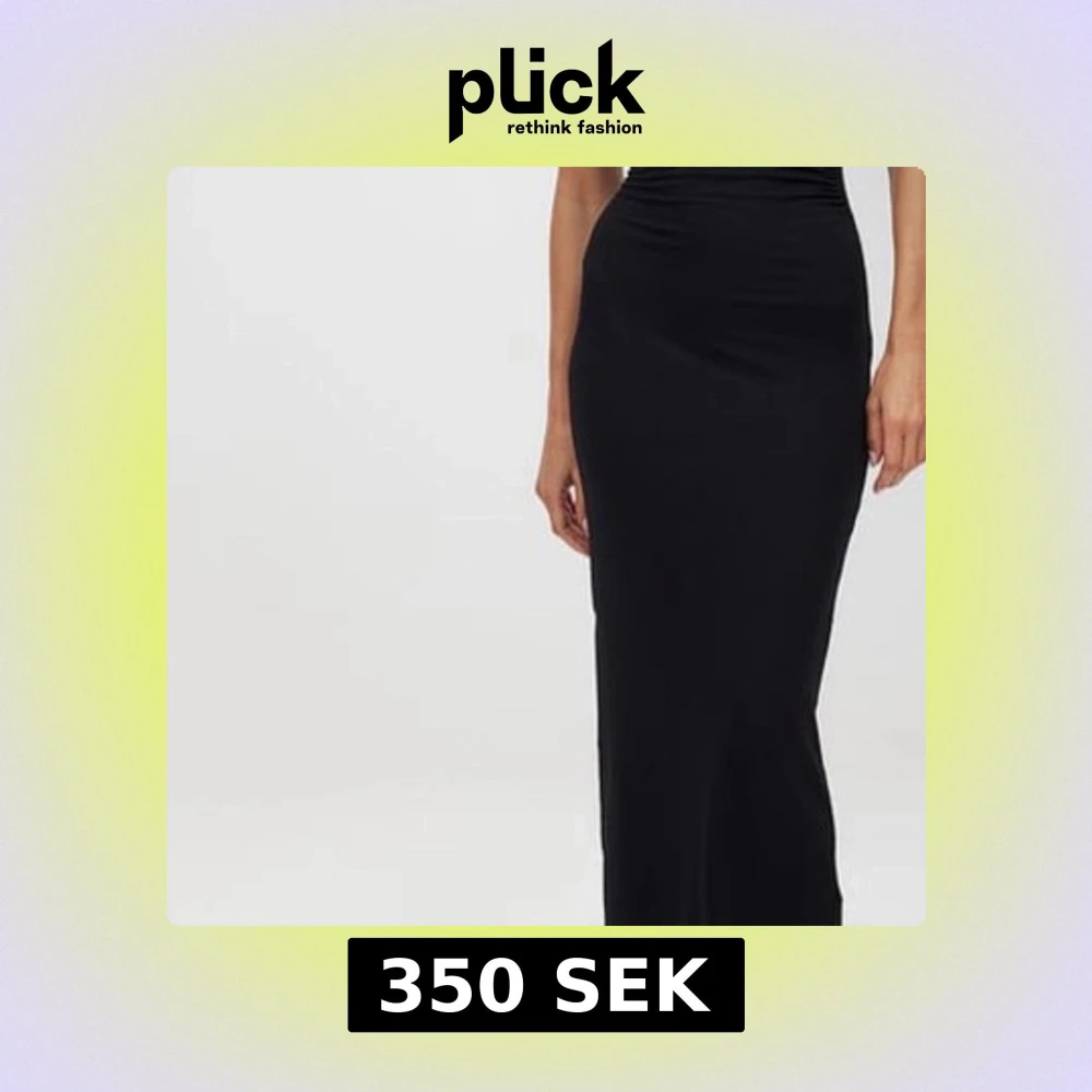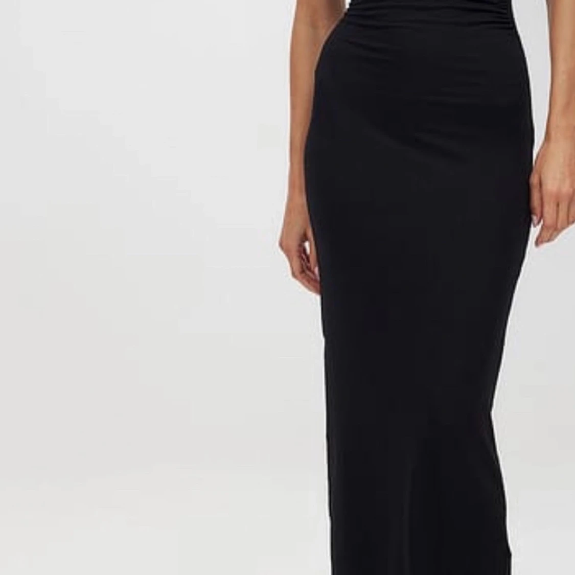 Elegant svart långklänning med en axelbandslös design. Perfekt för en stilren och sofistikerad look.