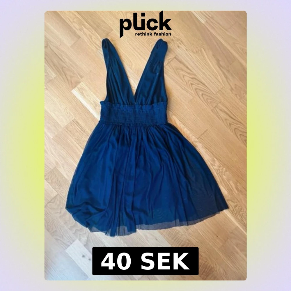 Snygg marinblå kortklänning med djup v-ringning och breda axelband. Kjolen är lätt utställd och har ett tunt, svepande tyg. Perfekt för dig som gillar en stilren och ungdomlig look.