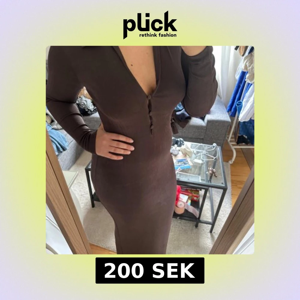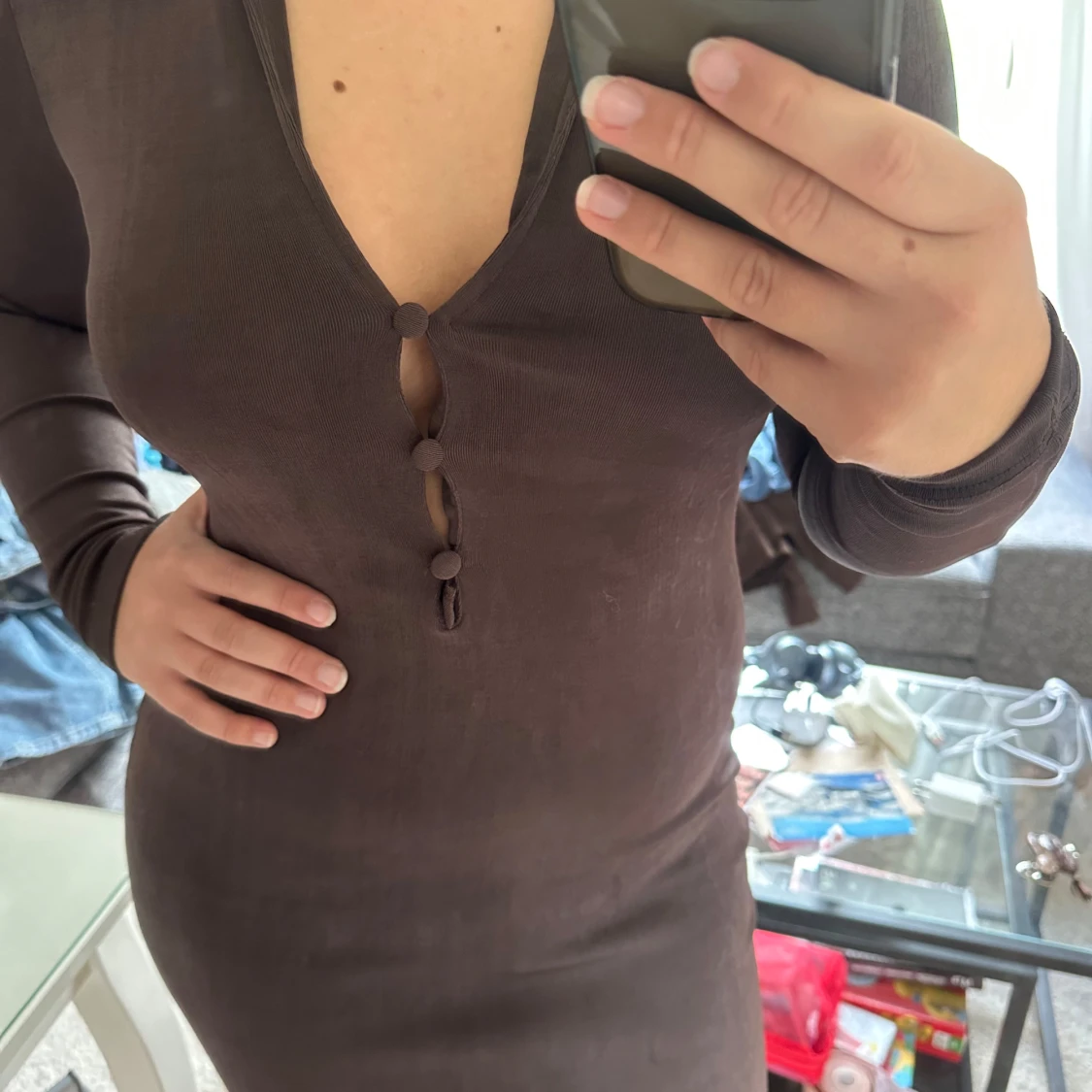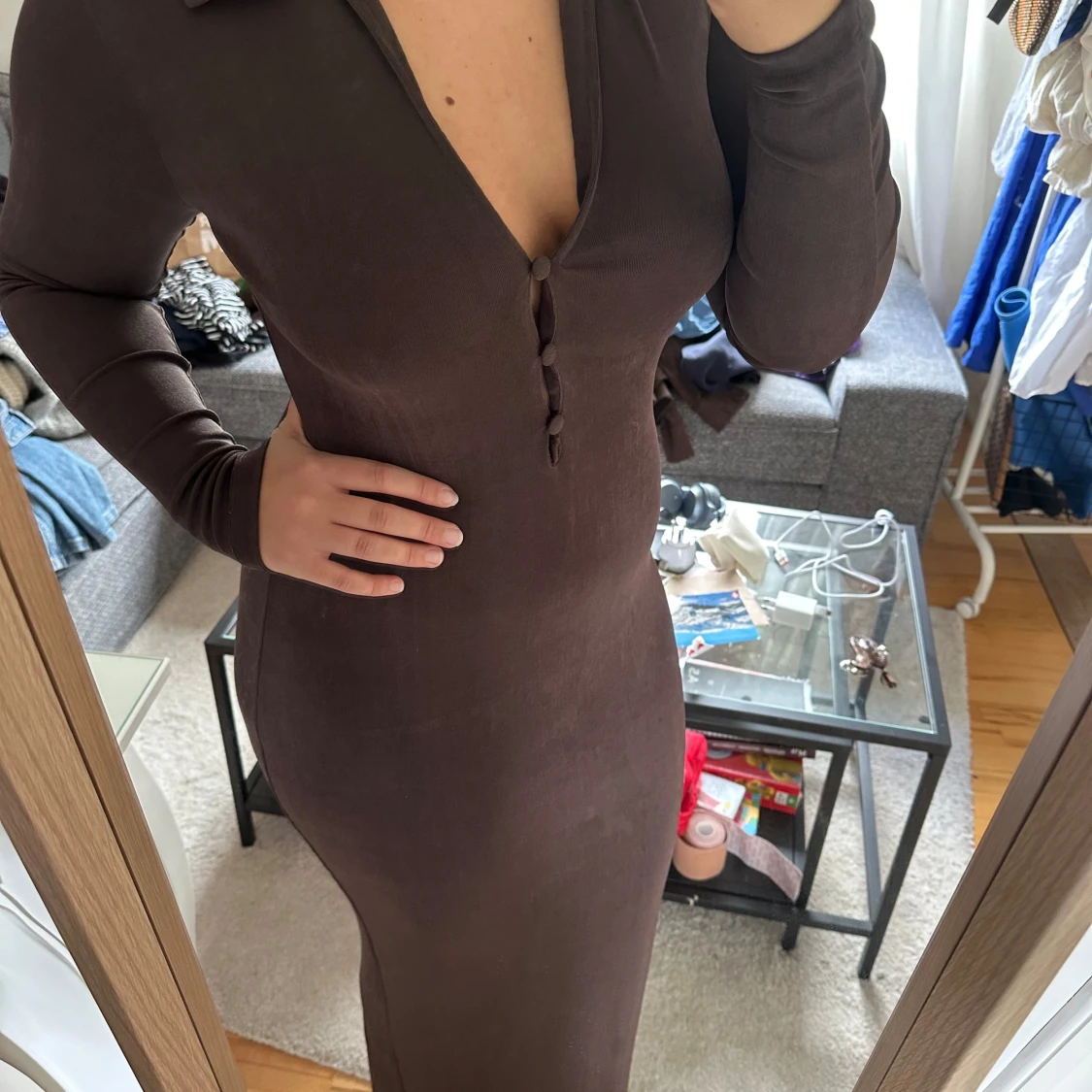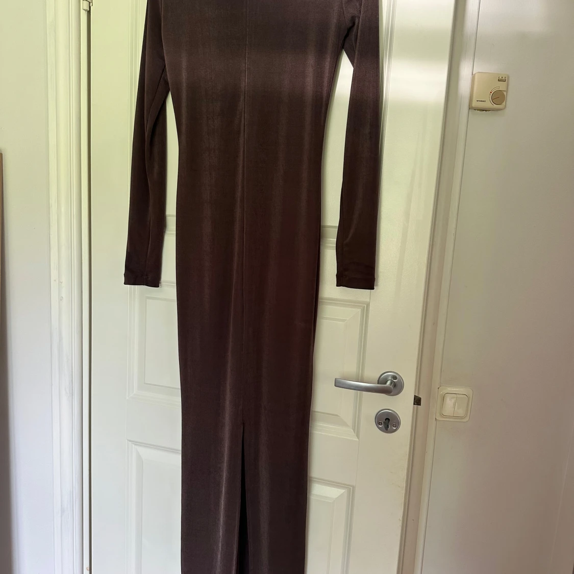 Snygg brun långklänning med lång ärm och djup v-ringning framtill. Väldigt bra skick.