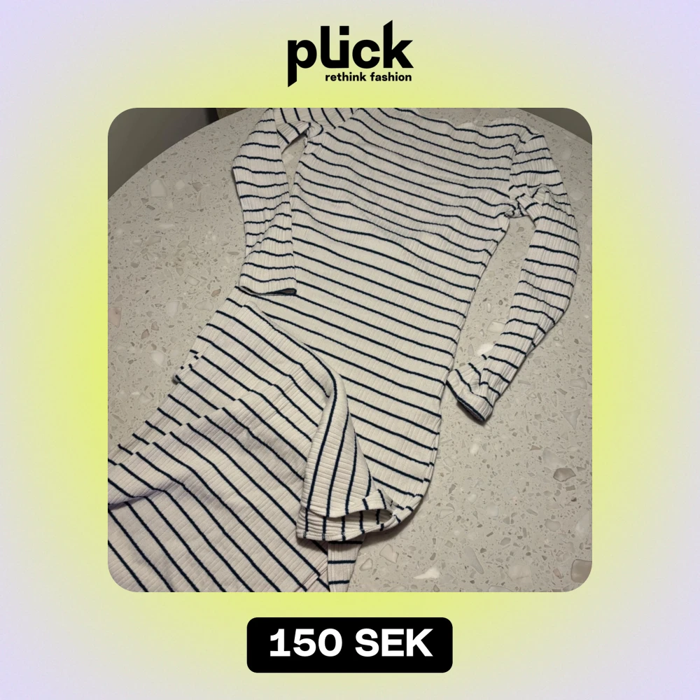 Säljer en superfin randig klänning från NA-KD i storlek M. Den är vit med mörkblå ränder och har en öppen rygg som ger en snygg detalj. Klänningen är ribbad och långärmad, och har en slits. perfekt för både vår och sommar. Passar till både vardag och fest!