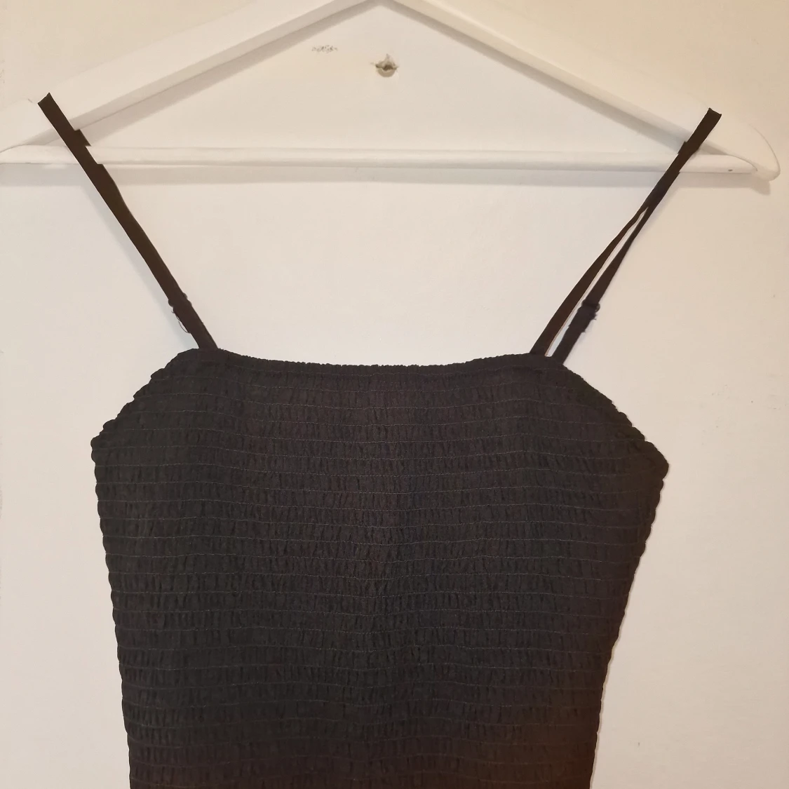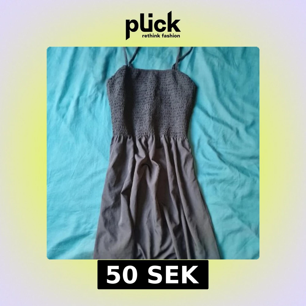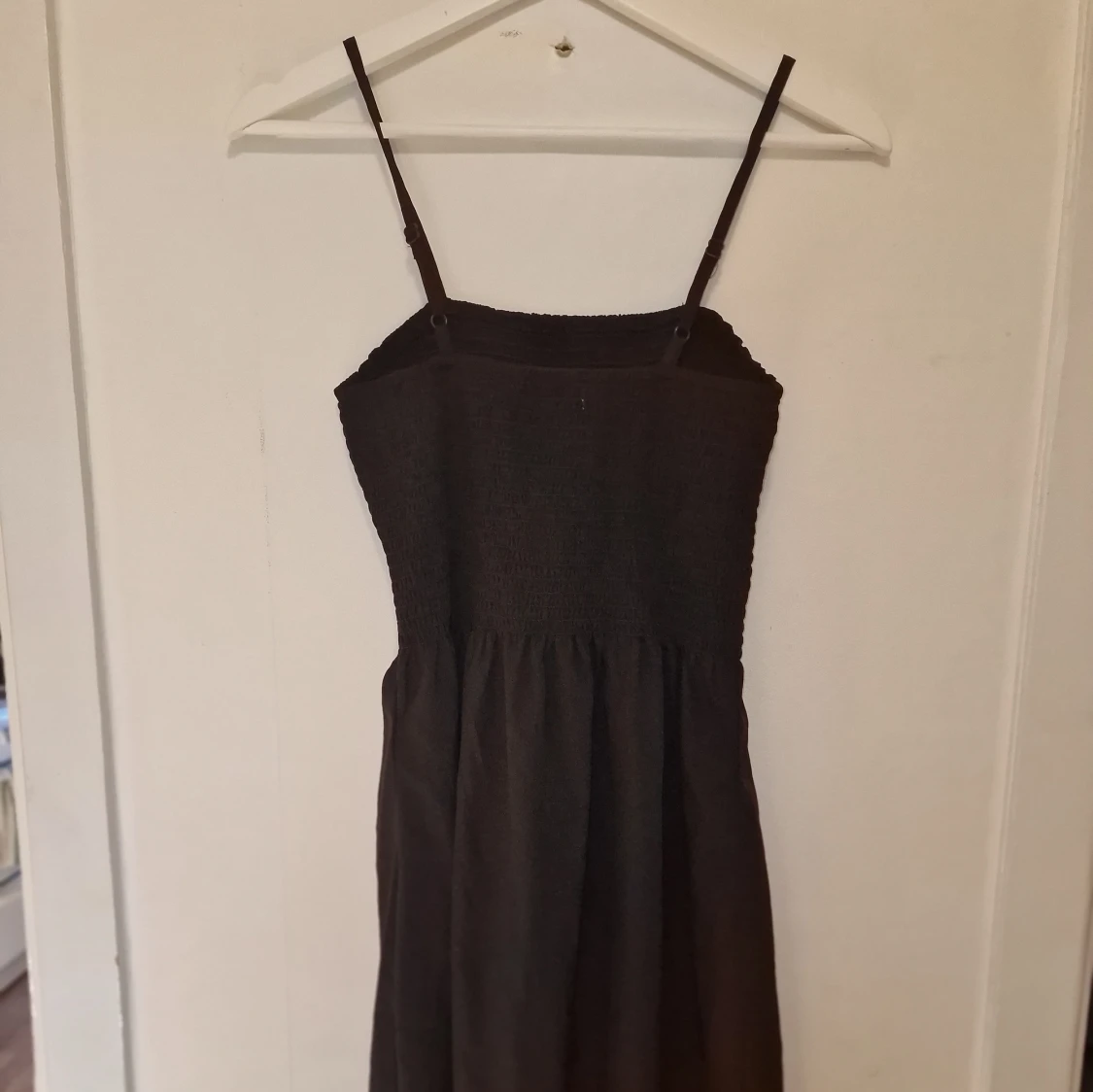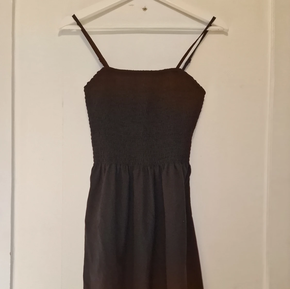 Klänning med smala axelband och smockad överdel. Kjolen är lätt utställd och tyget känns mjukt och luftigt, perfekt för varma dagar. Enkel och stilren design som är lätt att matcha med accessoarer.