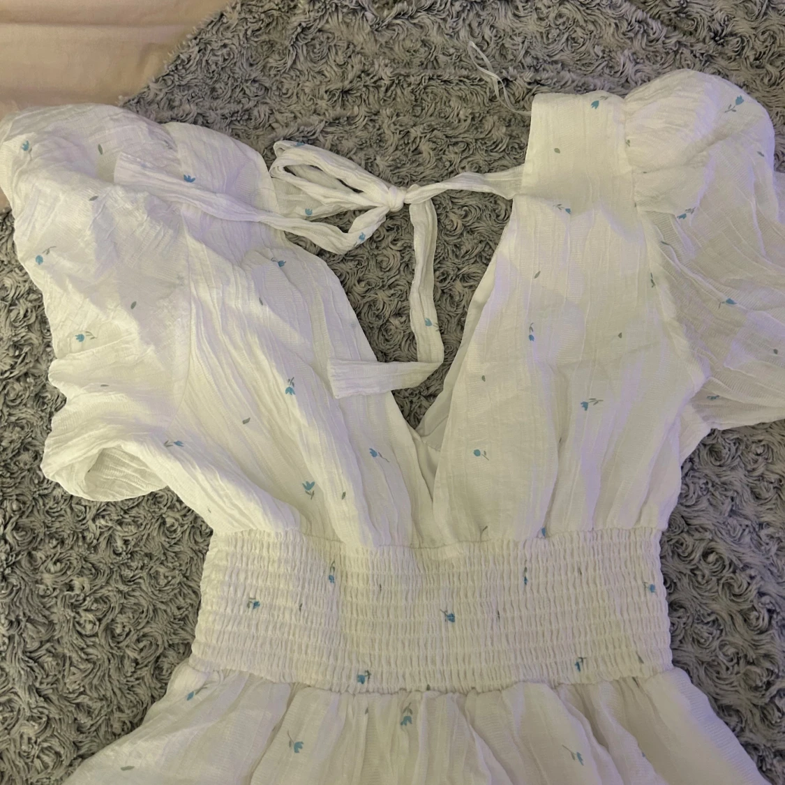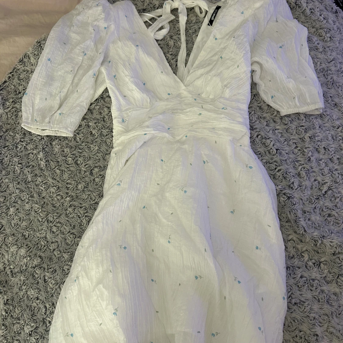Superfin vit klänning från NA-KD med små blå blommor, puffärmar och smock i midjan. Djup v-ringning med knyt i ryggen och lätt, luftig bomullskänsla. Perfekt för varma dagar och ger en romantisk vibe.