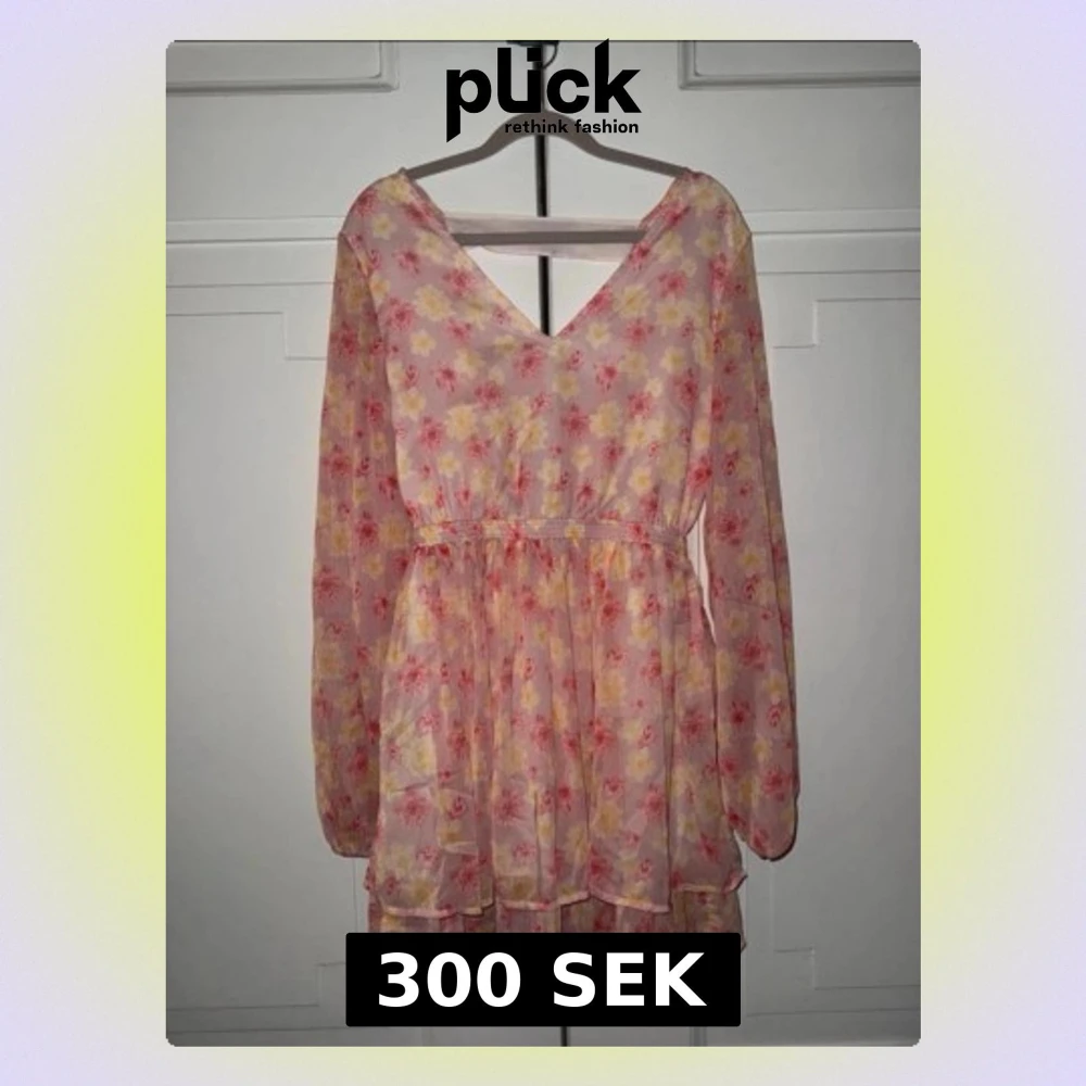 Söt kortklänning med blommigt mönster i rosa, gul och vit. Klänningen har v-ringning, långa ärmar och volangdetaljer nedtill. Tillverkad i ett lätt och luftigt material, perfekt för varma dagar. Midjan är markerad med resår för en smickrande passform. Öppen i ryggen med knytning