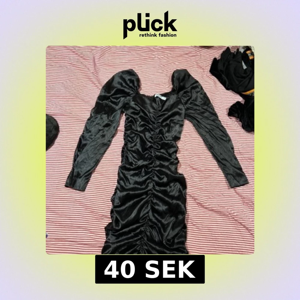 Snygg svart klänning i glansigt material med rynkdetaljer längs hela framsidan. Klänningen har långa ärmar och en figurnära passform som ger en elegant look.