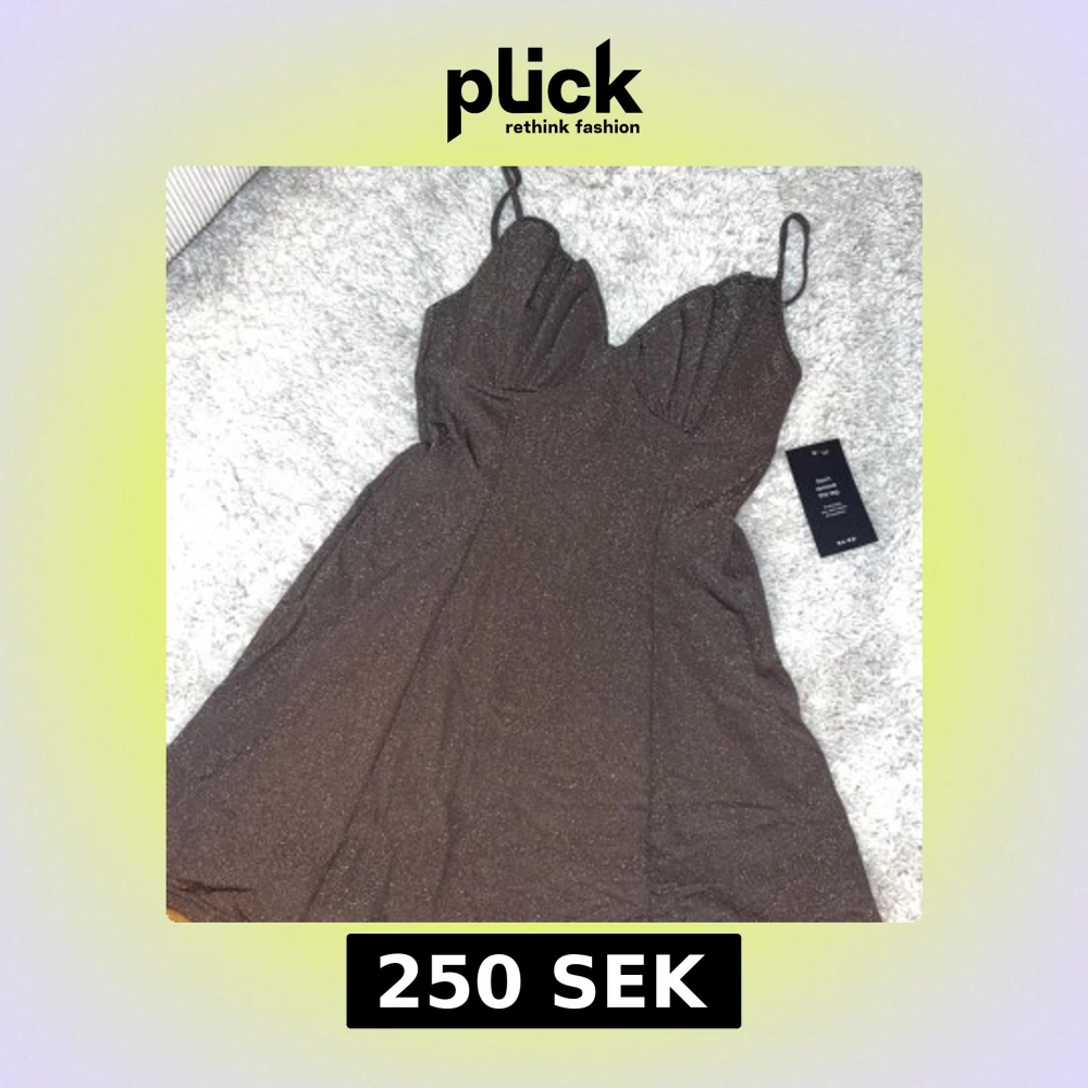 Snygg brun klänning med glittrigt tyg och smala axelband. Perfekt för en kväll ute eller en speciell tillställning. Klänningen har en figurnära passform upptill och en lätt utsvängd kjol. Den är ny och har kvar lapparna