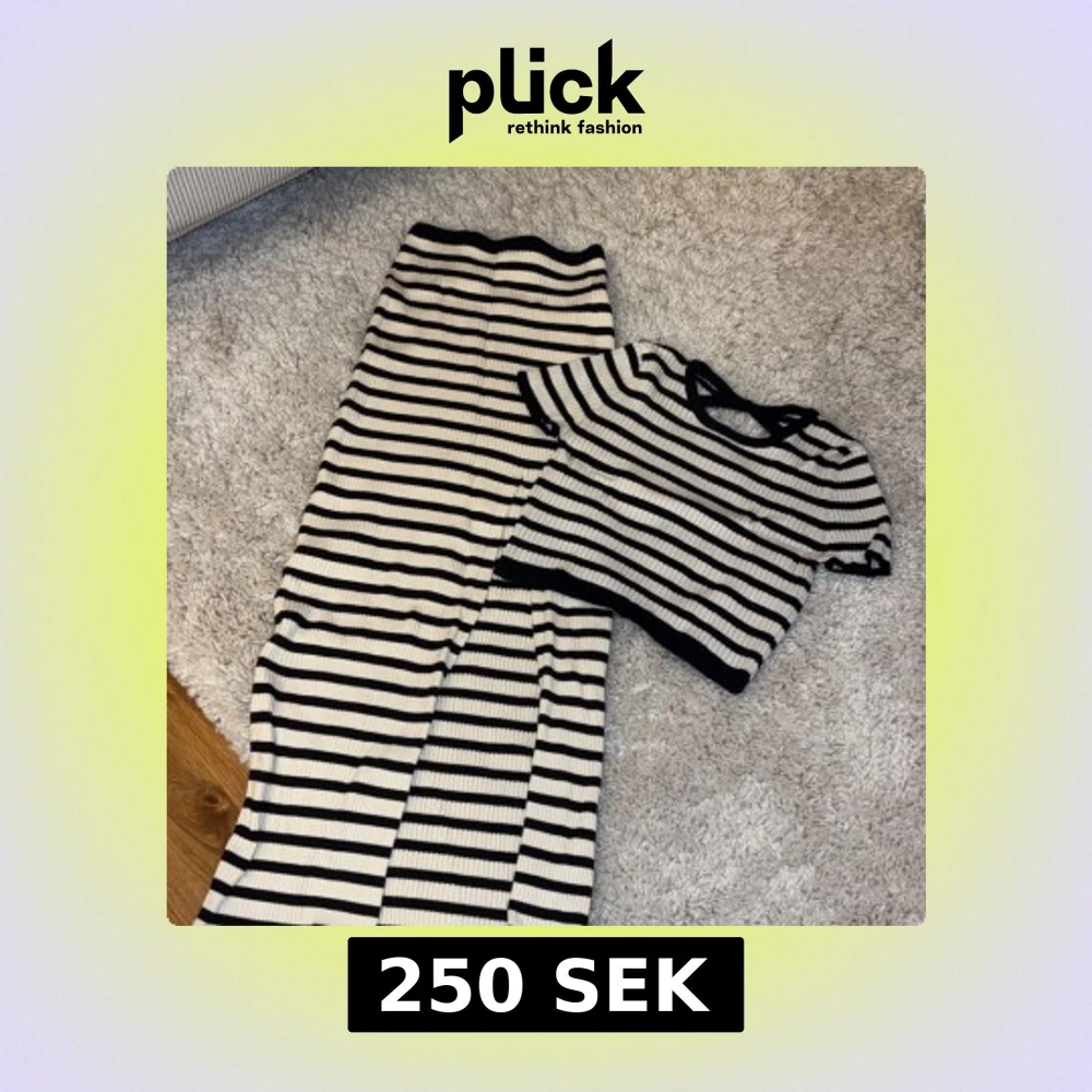 Snygg ribbad topp och kjol med svart och vit randigt mönster. Toppen har korta ärmar och en rund halsringning. Perfekt för en stilren look.
