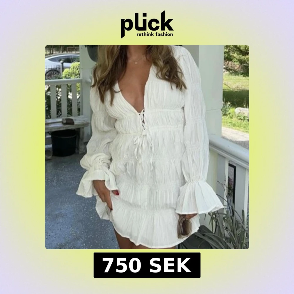 Superfin vit klänning med djup v-ringning, långa volangärmar och knyt framtill. Moa Mattsson x NAKD