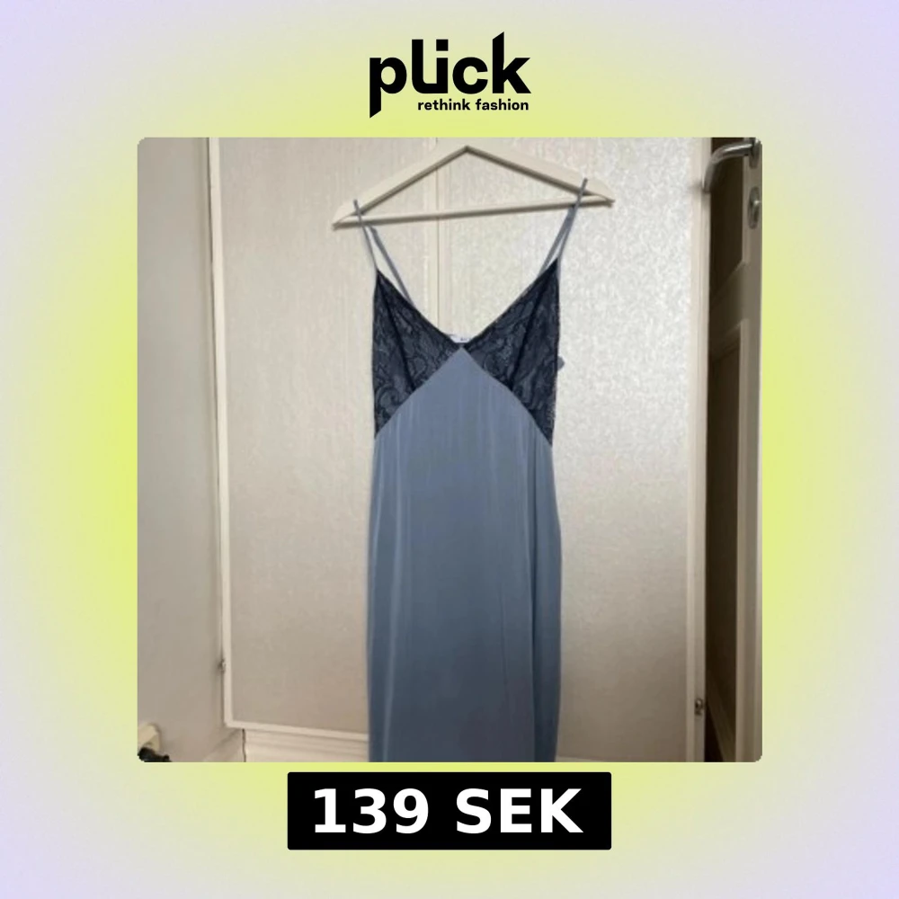 Säljer en ljusblå långklänning med tunna axelband och v-ringning. Överdelen har svarta spetsdetaljer som ger en elegant touch. Klänningen har dragkedja i sidan och är tillverkad i ett mjukt, lätt material.