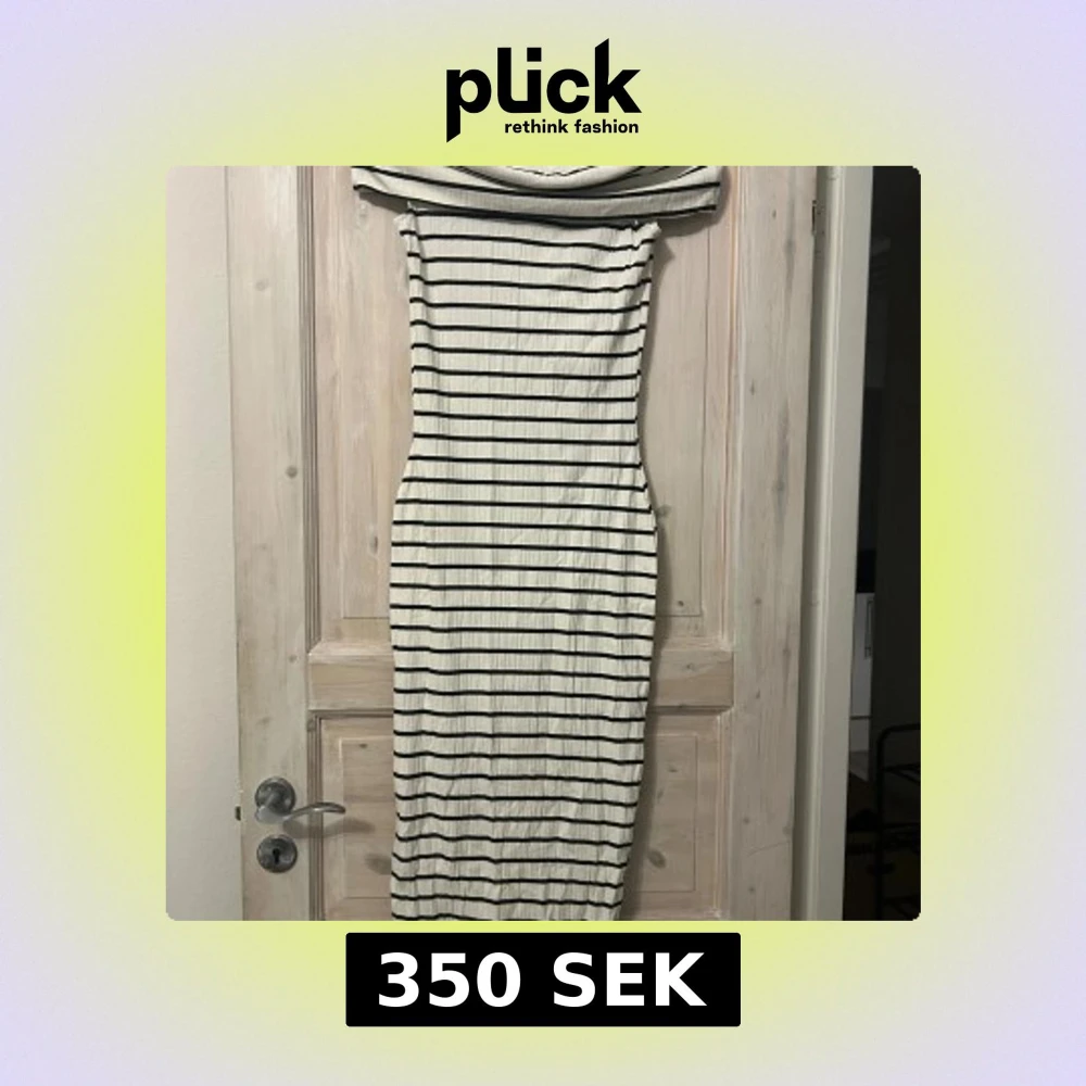 Säljer en snygg långklänning med svartvita horisontella ränder och offshoulder-krage. Klänningen har en figurnära passform och är tillverkad i ett mjukt, ribbat material som ger en cool och modern look. Perfekt för dig som gillar stilrena och trendiga plagg.