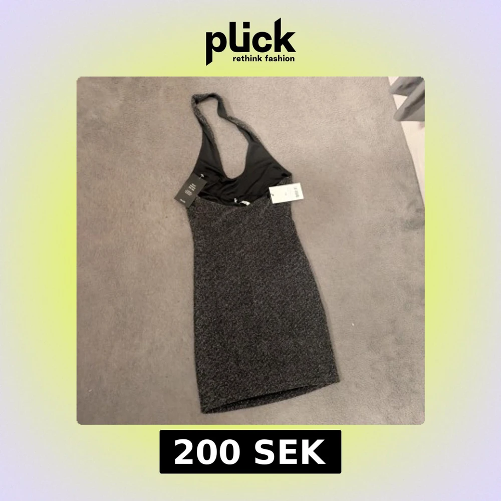 Supersnygg svart glittrig kortklänning med halterneck och djup urringning. Tight passform som framhäver figuren och perfekt för att sticka ut. Materialet är stretchigt och skimrar snyggt i ljuset.