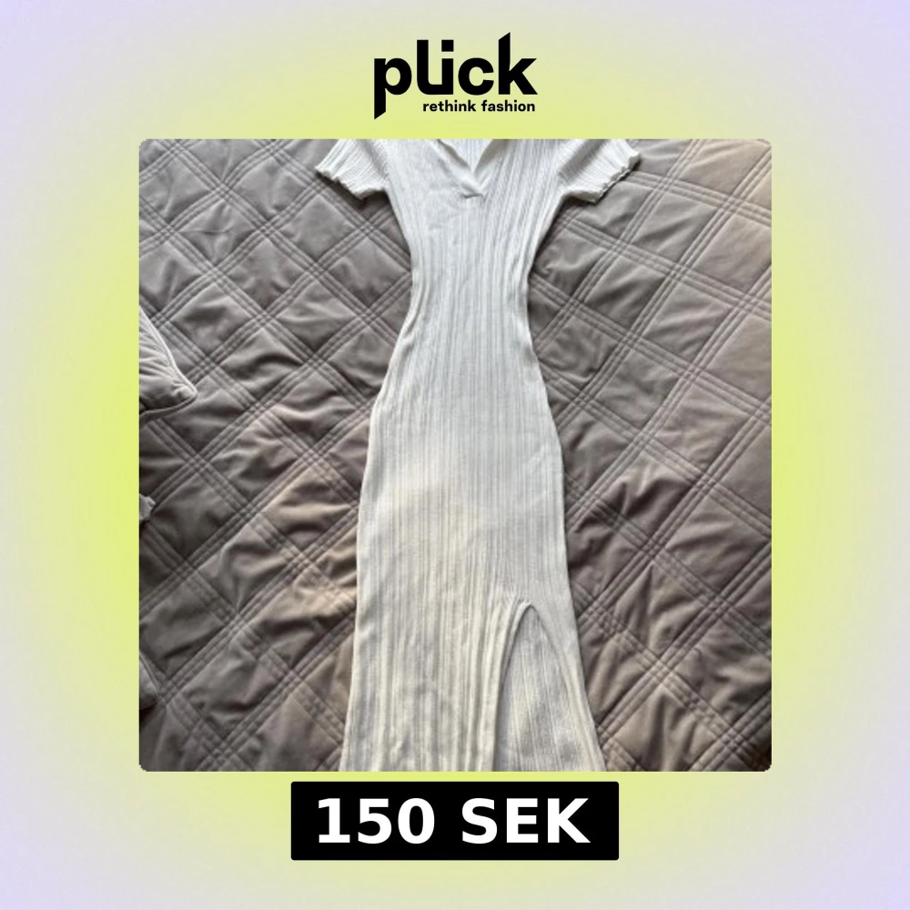 Supersnygg vit ribbad långklänning från NA-KD med krage, v-ringning och korta ärmar. Klänningen har en figurnära passform och en slits nertill för extra edge. Perfekt för dig som gillar stilrena och trendiga plagg.