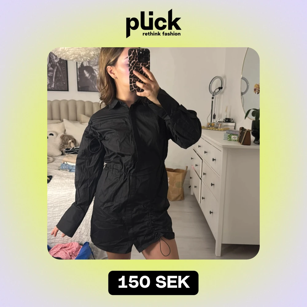 Snygg svart klänning med knappar framtill och långa ärmar. Den har en justerbar dragsko i midjan för en perfekt passform. Perfekt för både vardag och festliga tillfällen. Enkel och stilren design som passar till allt!