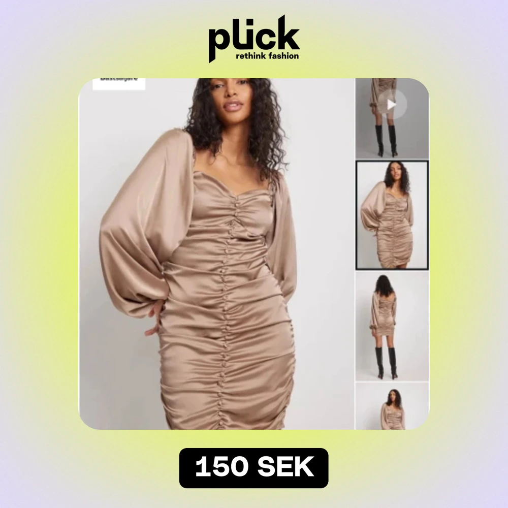 Säljer en superfin beige kortklänning med ballongärmar. Klänningen är i ett glansigt material som ser ut som satin och har en tight passform. Den har en snygg rynkad detalj framtill och en v-ringad hals. Perfekt för fest eller en utekväll! 💖Endast använd engång.