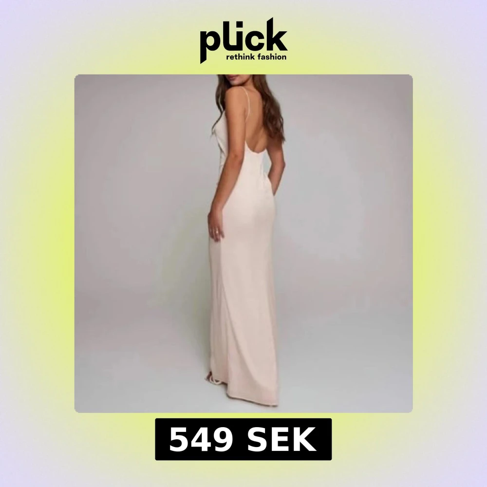 Elegant champagnefärgad långklänning med smala axelband och öppen rygg. Perfekt för en stilren och sofistikerad look. Klänningen har en figurnära passform som framhäver silhuetten. Slut såld på nellys hemsida original pris 799. Ändast använd 1 gånga där av pris! 💕