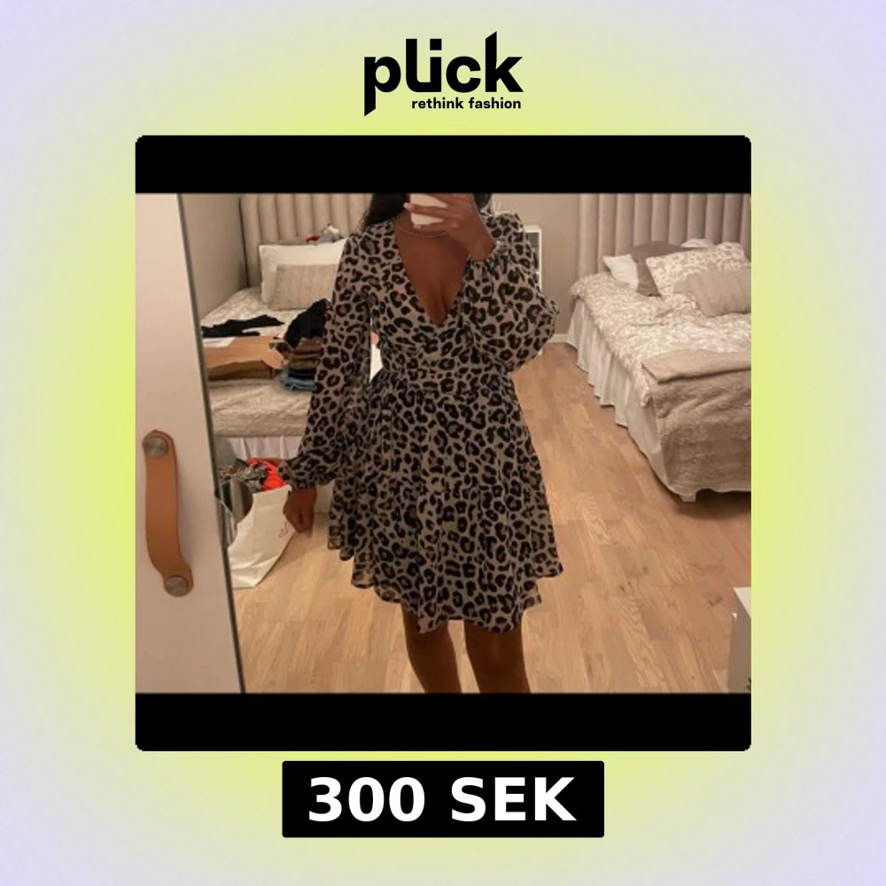Snygg kort leopardmönstrad klänning med omlottmodell och v-ringning. Klänningen har långa, luftiga ärmar och markerad midja med knytband. Tyget är lätt och ger ett flowy intryck, perfekt för dig som vill sticka ut med ett djurmönster. Nyskick