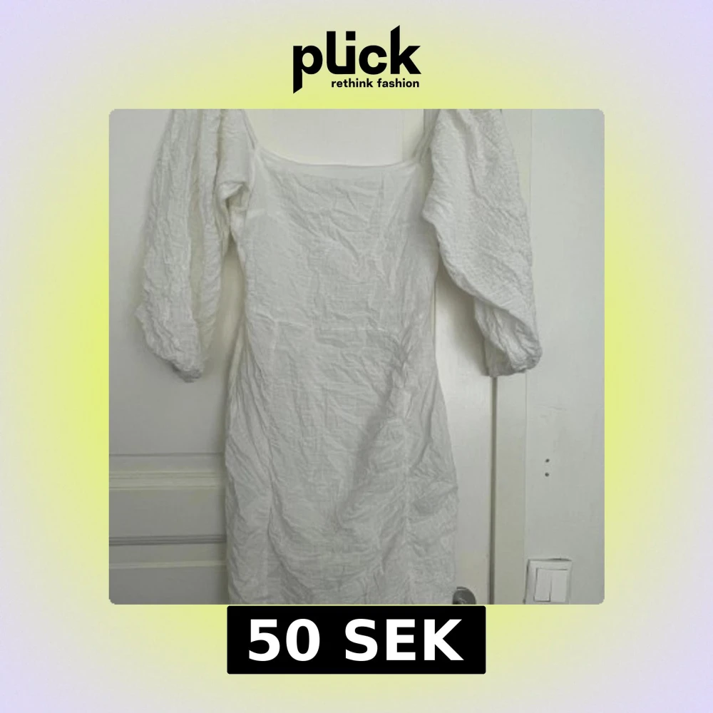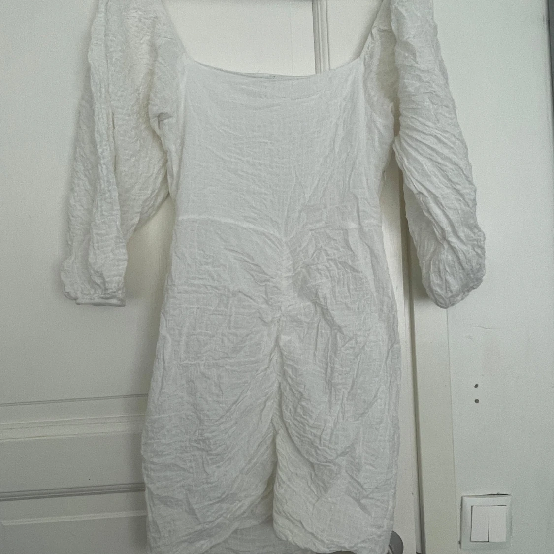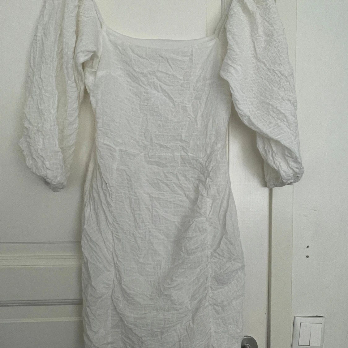 Superfin vit kort klänning med puffiga trekvartsärmar och fyrkantig ringning. Klänningen har en lätt skrynklig struktur och är figurnära i modellen. Perfekt för dig som gillar en romantisk och trendig look.etiketen klippte jag av men den är från Nelly